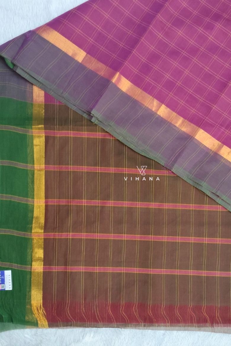 The Magenta saree features a distinct Yellow checkered pattern , has horizontal stripes with gold zari along the contrasting Green borders and Pallu.