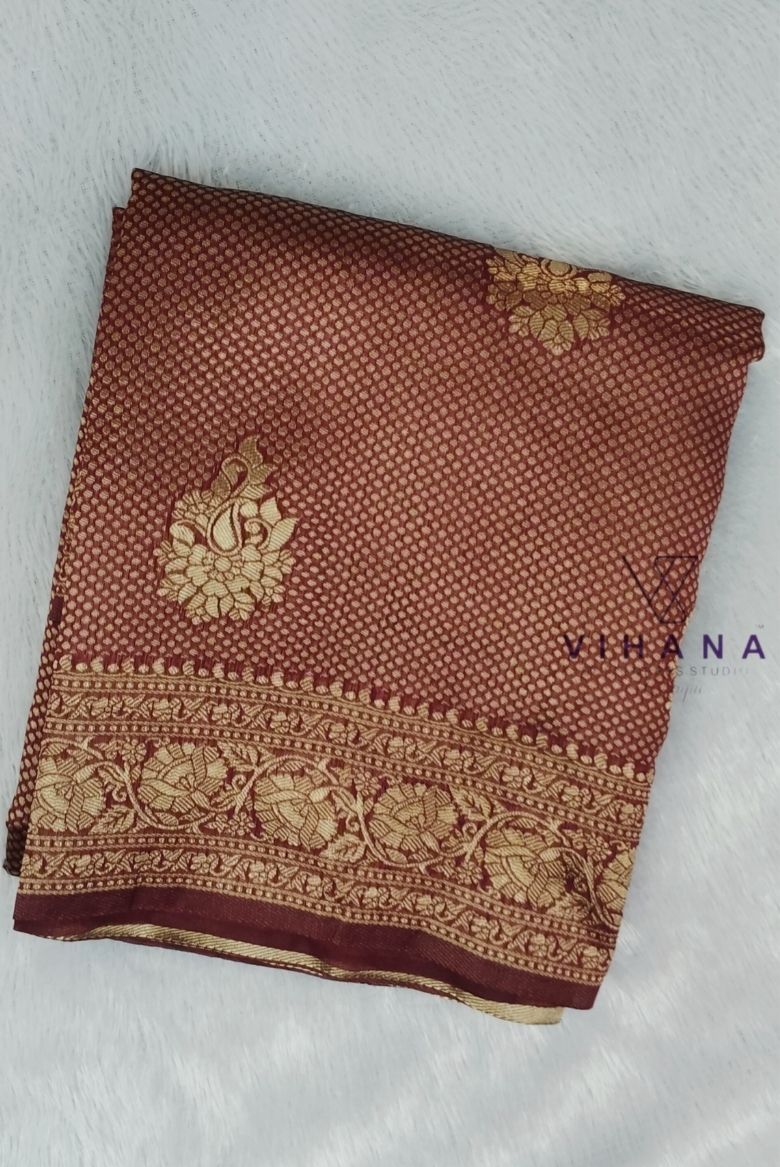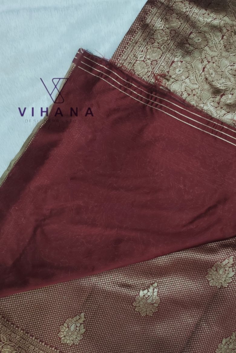 Banarasi silk saree features a rich maroon base adorned with intricate golden zari weaving. The body is decorated with classic butta motifs , floral print and golden zari border including running blouse
