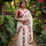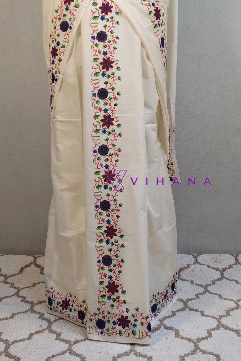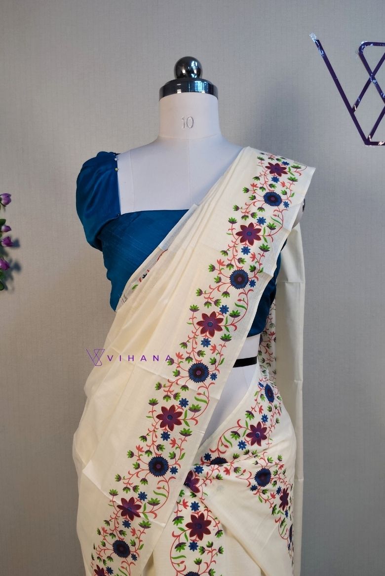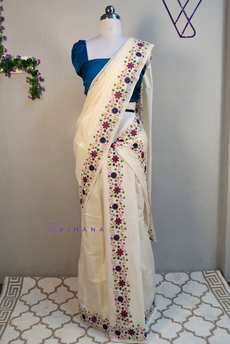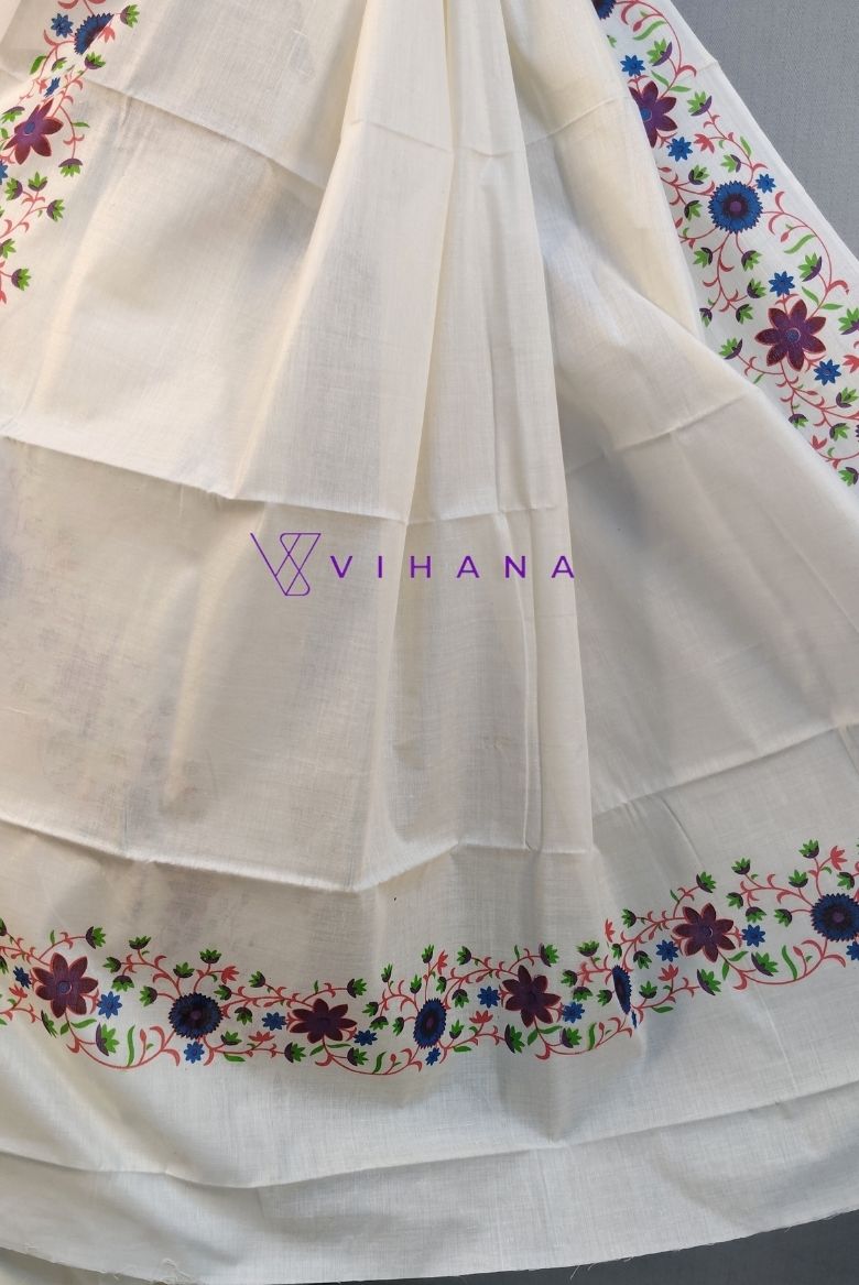 The set mundu in the image is an off white handloom set mundu with multicolored floral painted design along the borders.