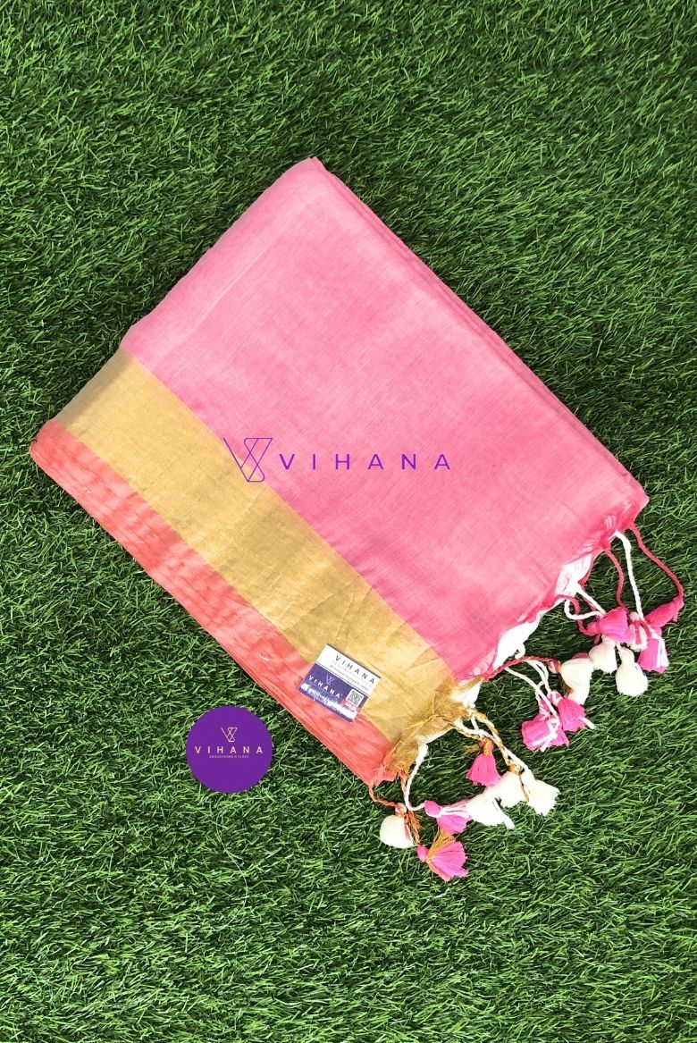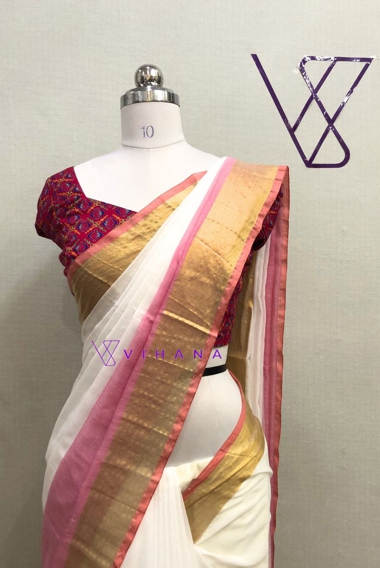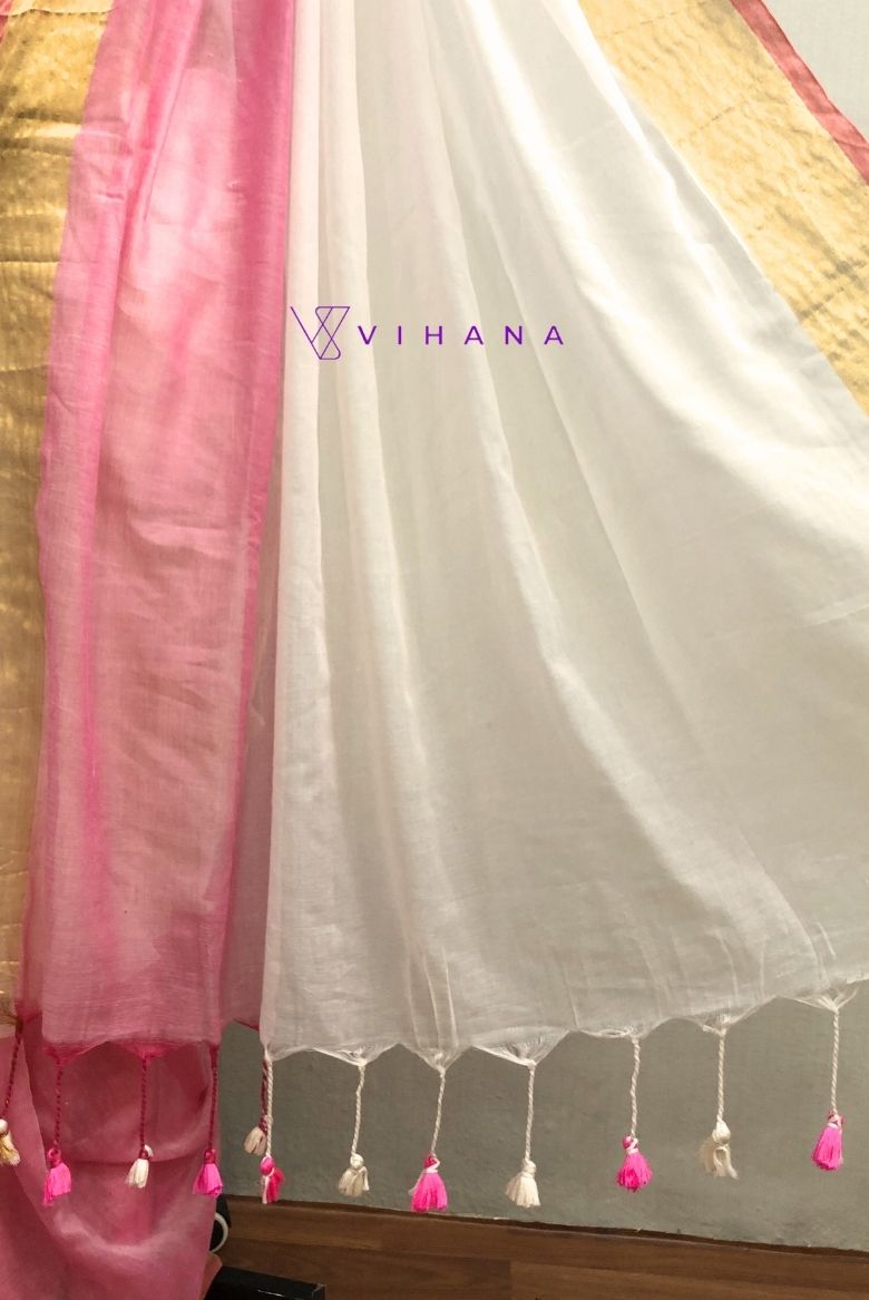 This saree has a classic white or cream body with a contrasting pink border, which often includes a delicate gold string or zari weave for an elegant touch. The pallu may also feature hand-finished tassels.