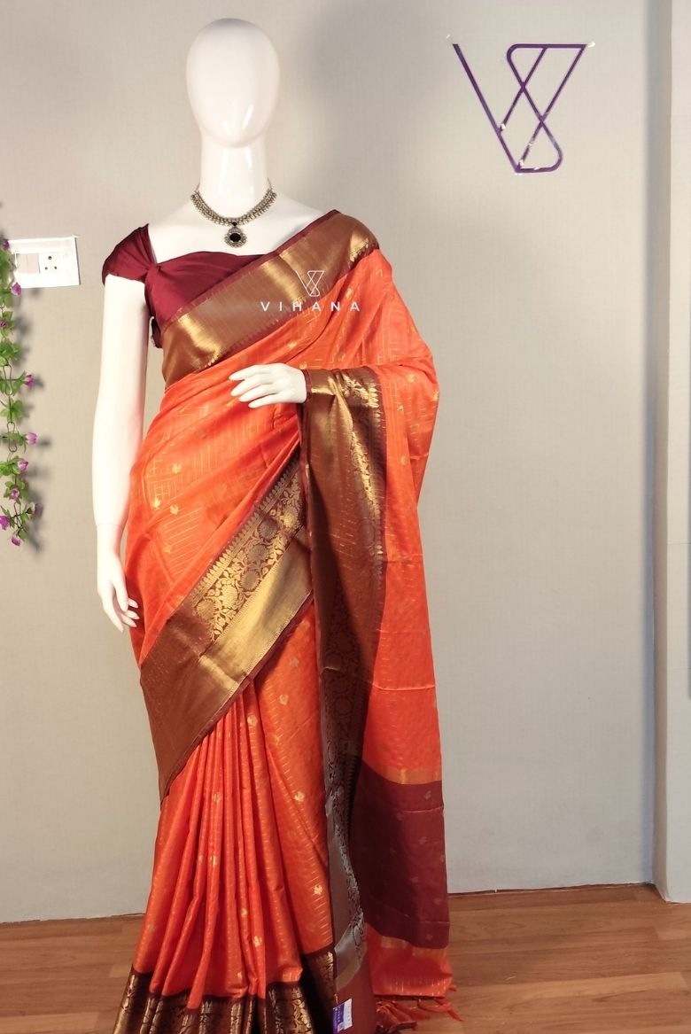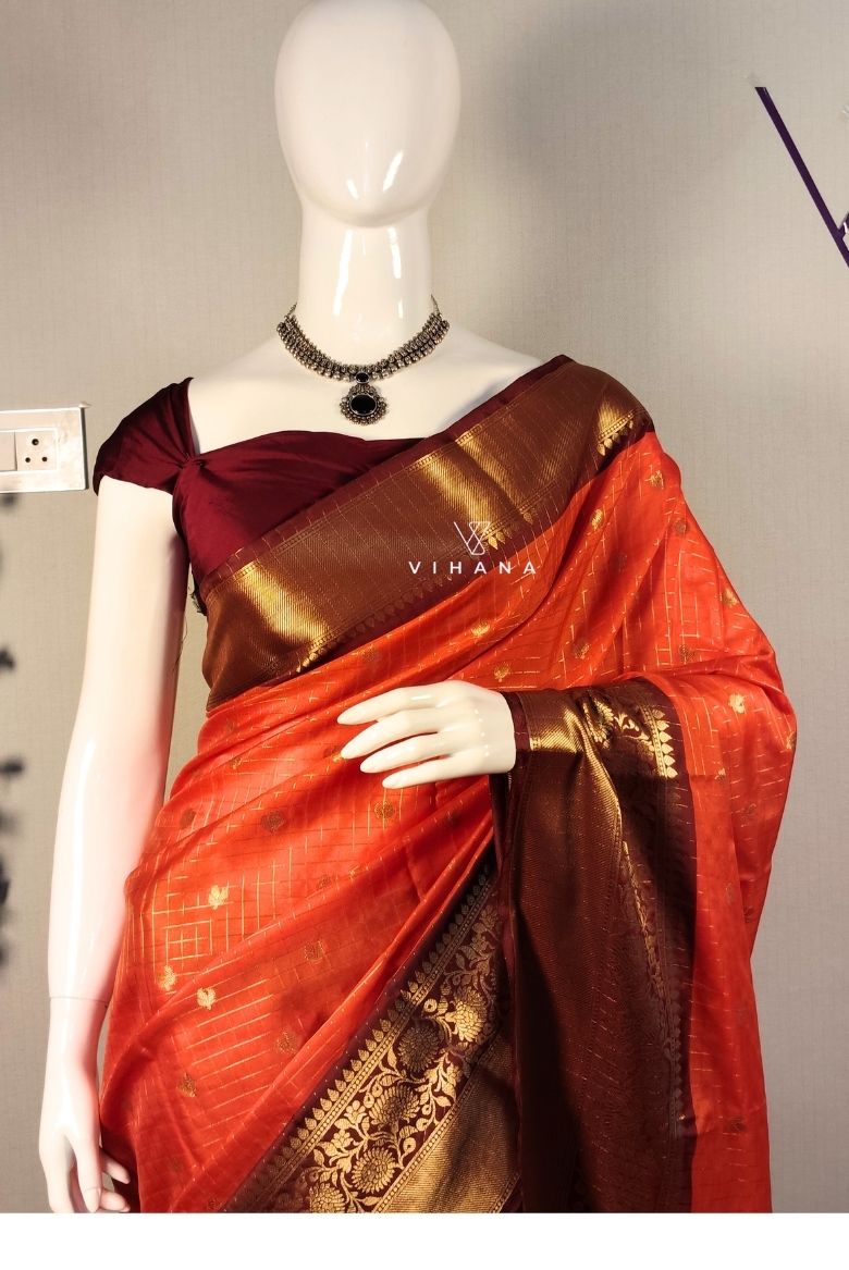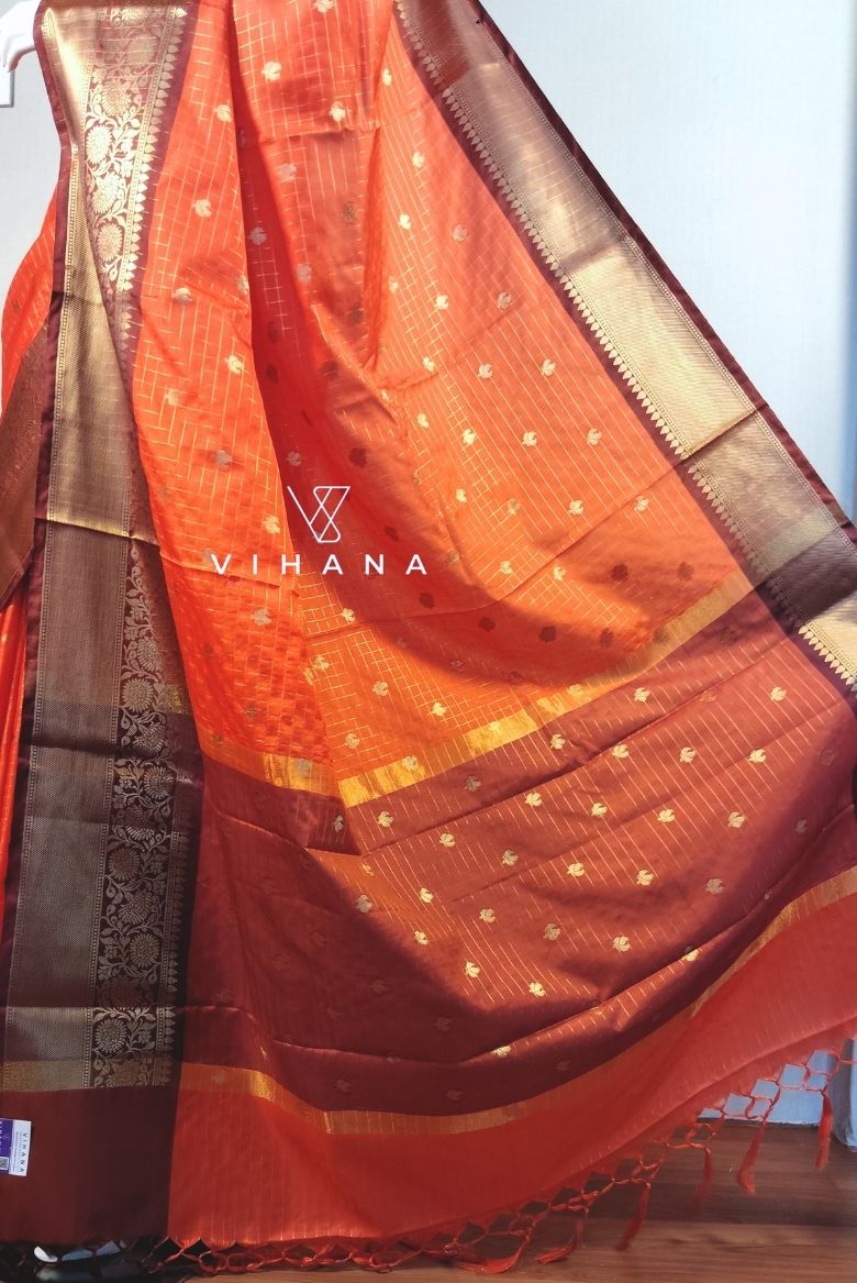 This saree Features a subtle checkerd pattern (also referred to as zari-woven checks) throughout the saffron orange base, contrasting maroon/brown border with intricate golden zari weaving, often featuring floral or geometric motifs. The pallu (end piece) matches the contrasting border and is typically adorned with elegant tassels.