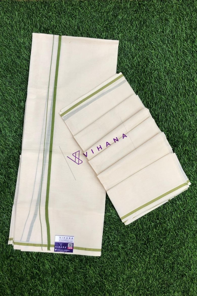 This set mundu features a classic off-white with parrot green puliyilakara border.