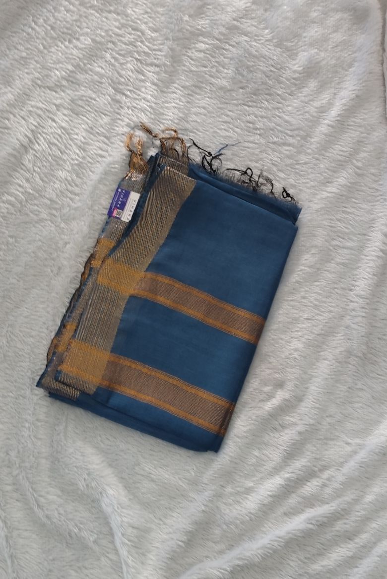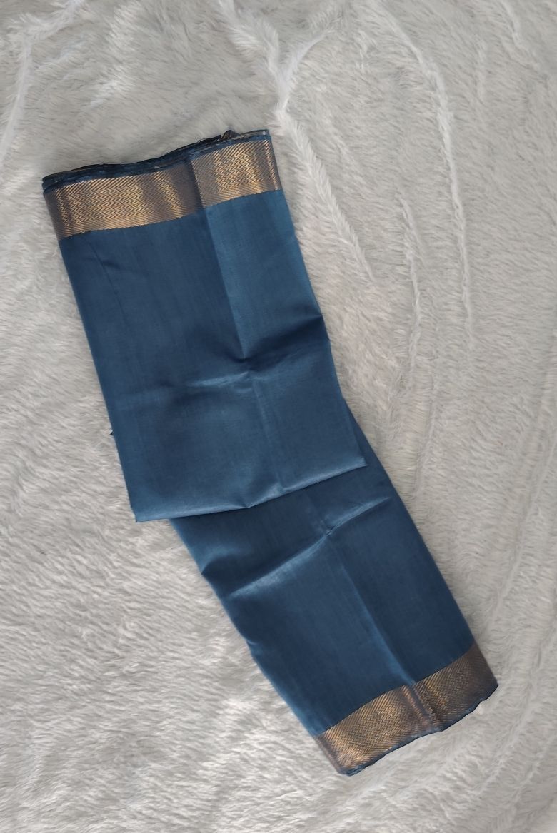 This saree features a rich pastel blue body with a prominent wide golden zari border . The Pallu is highlighted with that same Golden zari stripe designs.