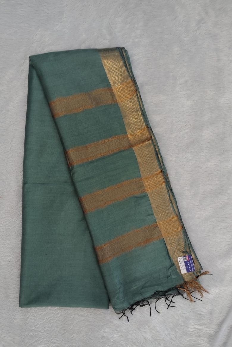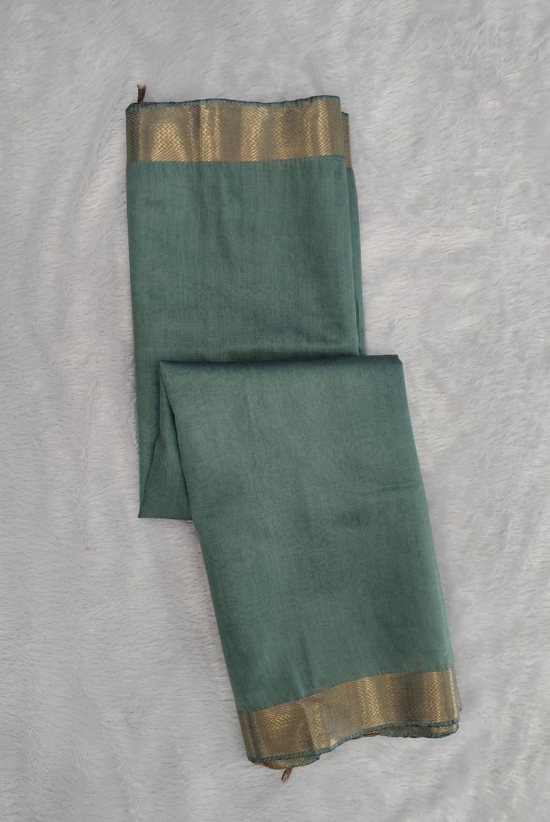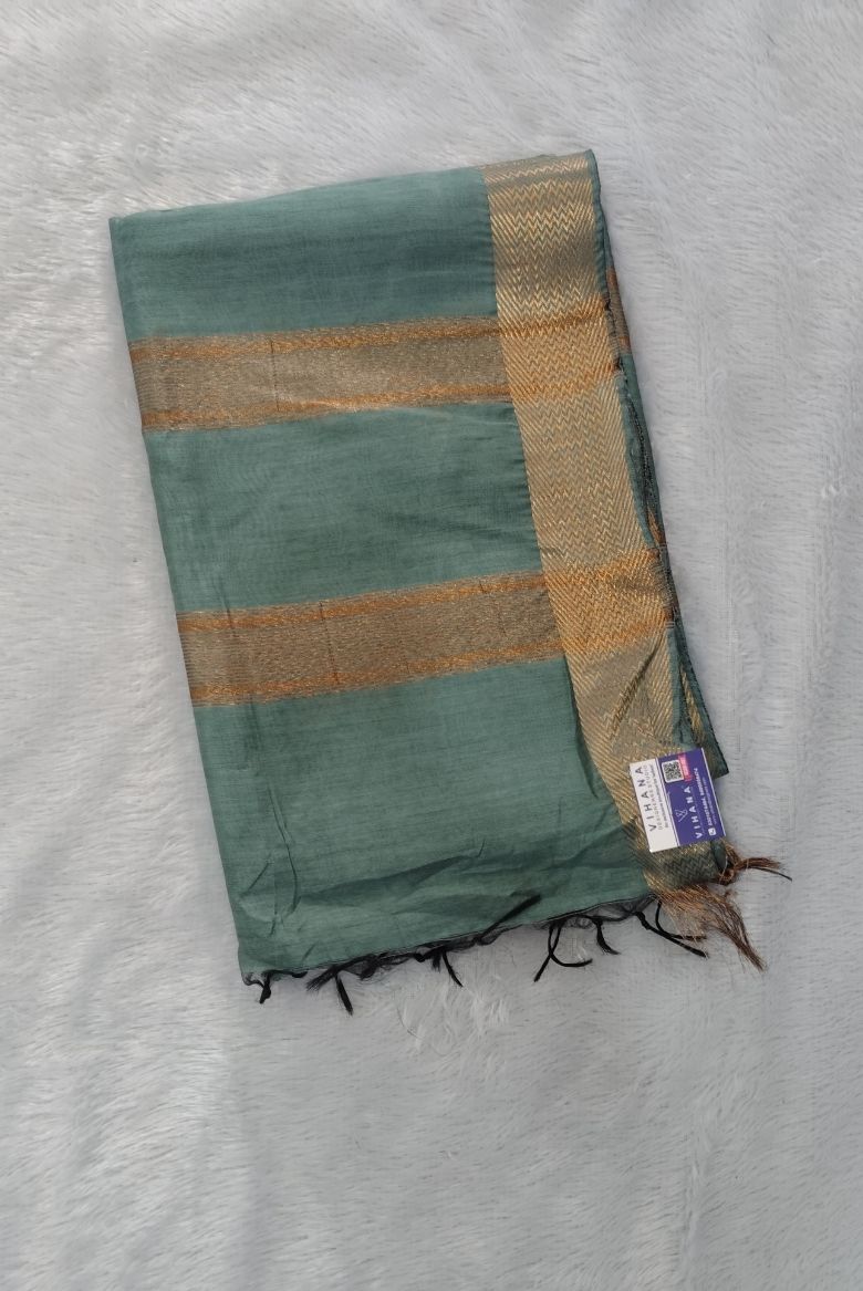 This saree features a Pastel Teal Blue body with a prominent wide golden zari border . The Pallu is highlighted with that same Golden zari stripe designs.