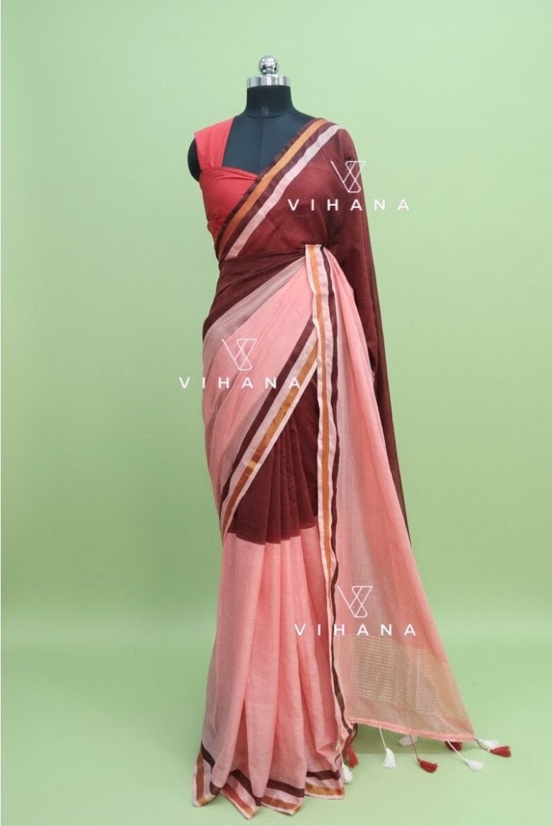 22 December 2025Peach and Brown Pure Mulcotton Saree120 count