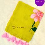 Lime Green Mul Mul Cotton Saree with Pink Floral Designs