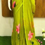 Lime Green Mul Mul Cotton Saree with Pink Floral Designs