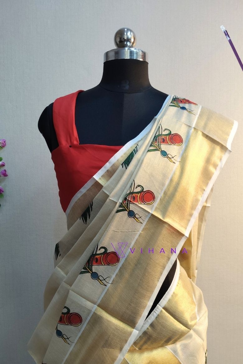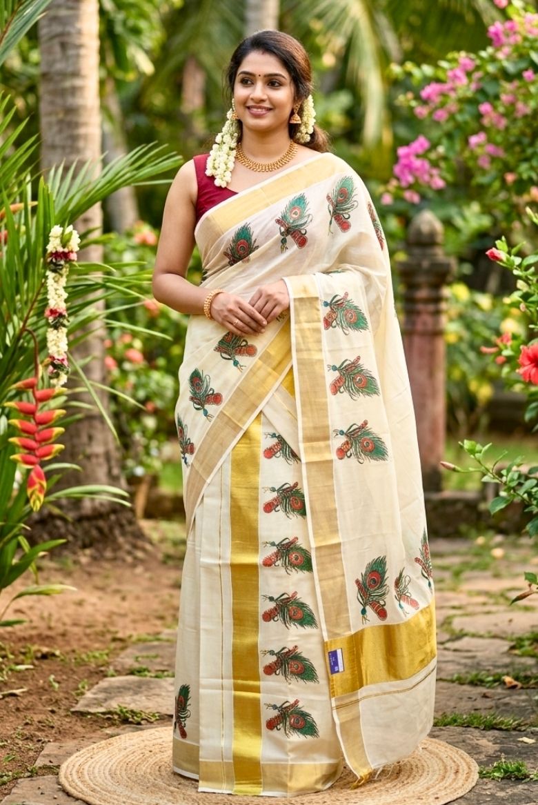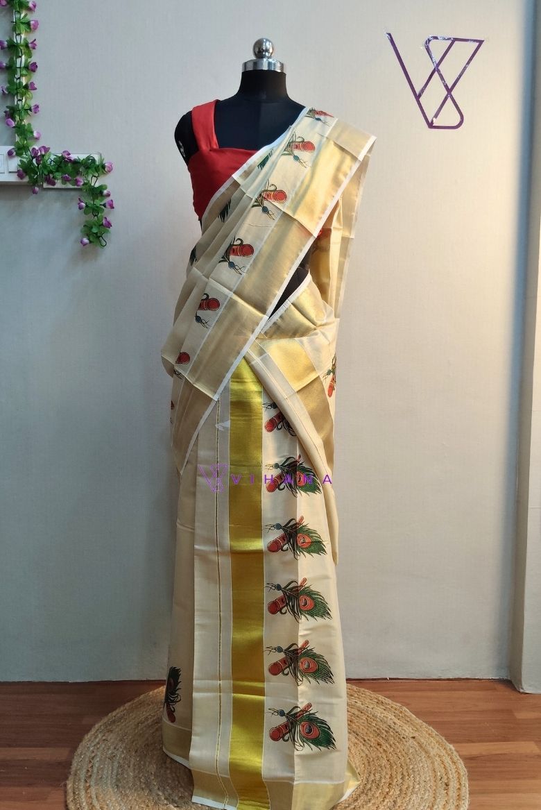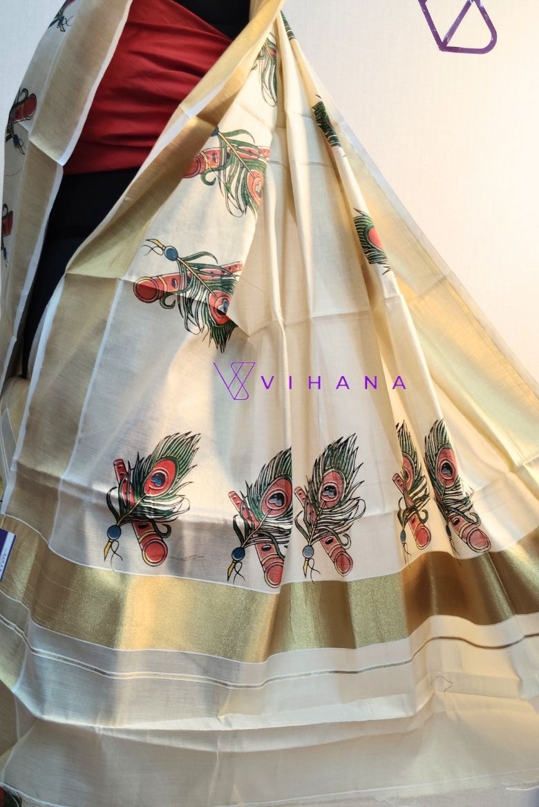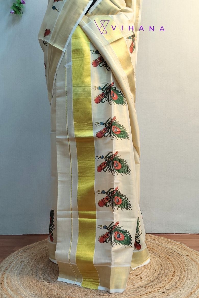 11 February 2026Peacock Feather and Flute Print Set Mundu with Classic Kasavu Elegance