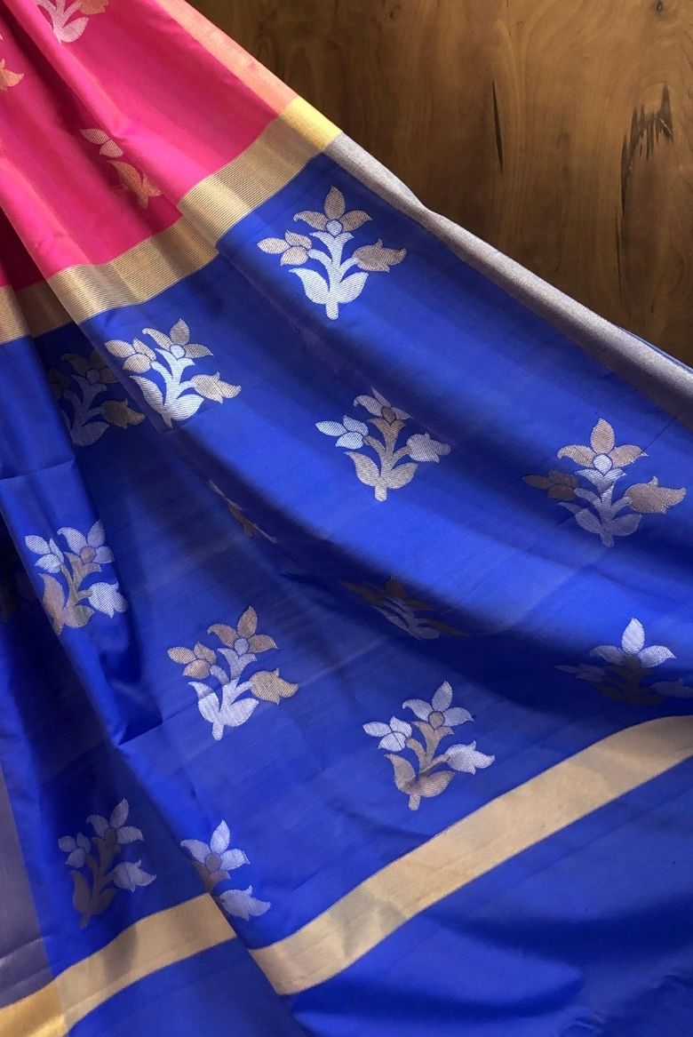This saree features intricate floral patterns using gold or silver zari threads , golden zari borders , and Pallu is highlighted with contrasting Blue colour .