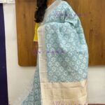 The soft Light blue Cotton Linen Saree featuring silver zari geometric(floral motifs) allover the body and the offwhite coloured Pallu is highlighted with mango motifs.