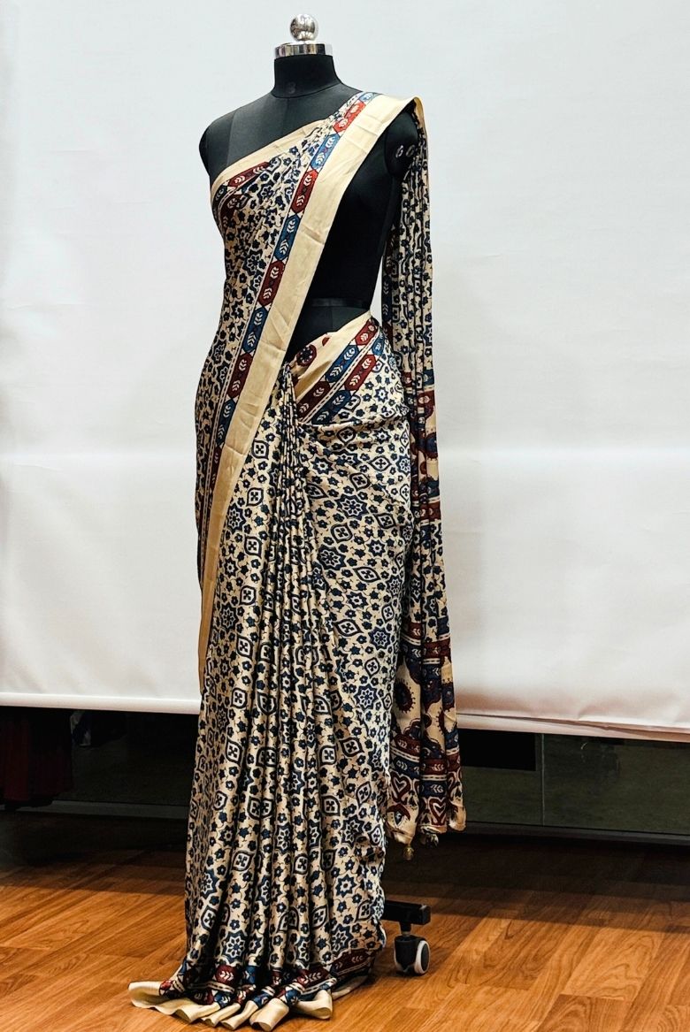 A sophisticated base of creamy off-white, contrasted with deep Indigo Blue and classic Madder Red accents. Features intricate Hand-Block Prints reminiscent of traditional Ajrakh motifs. The geometric and floral patterns are meticulously arranged to create a rhythmic visual appeal.