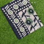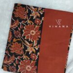 This Mulmul Cotton Saree features a striking black base adorned with beige paisley motifs, complemented by a geometric floral border and a touch of rust-red edging that adds sophistication and warmth.