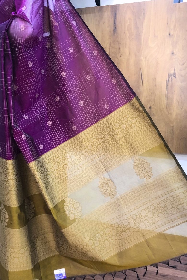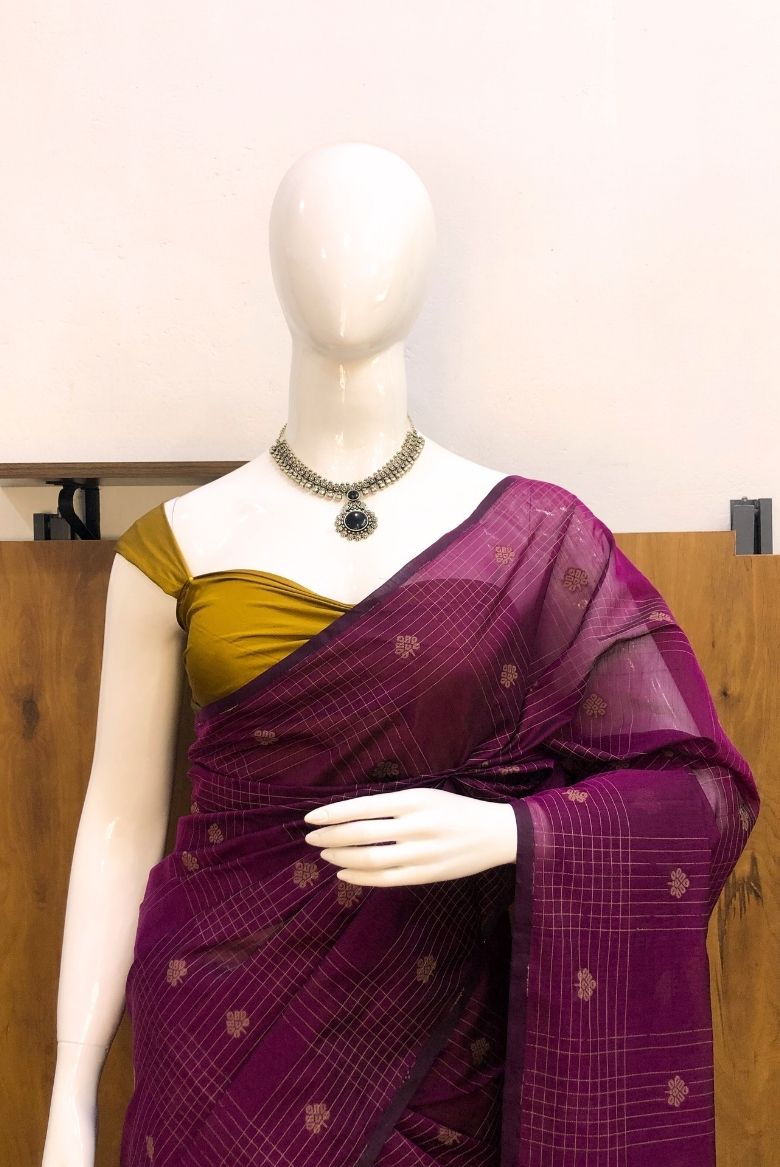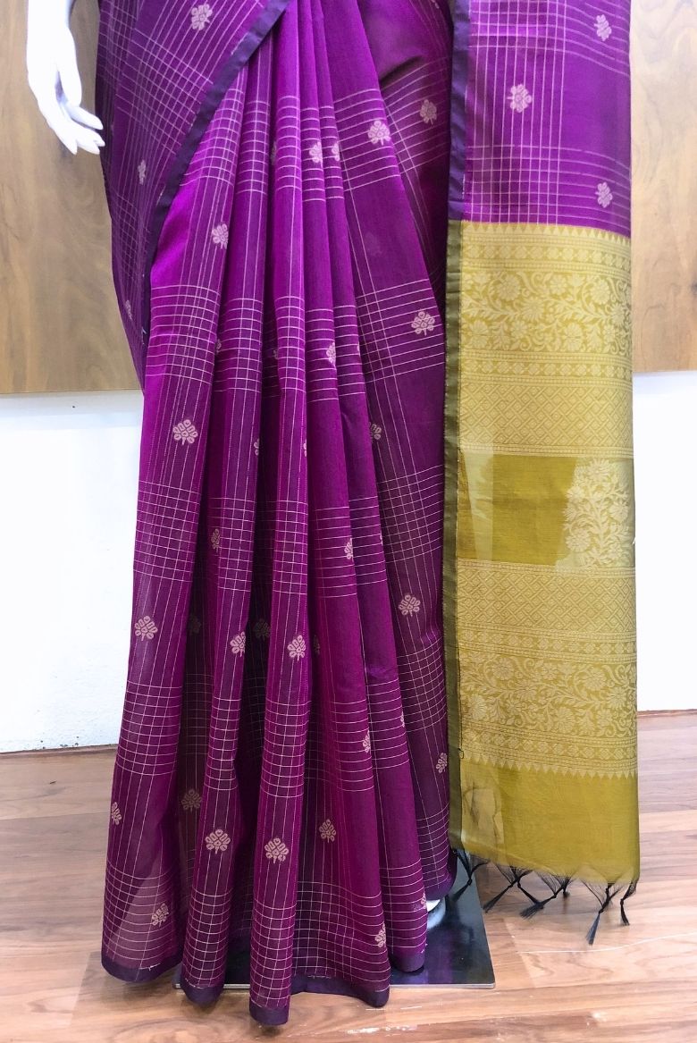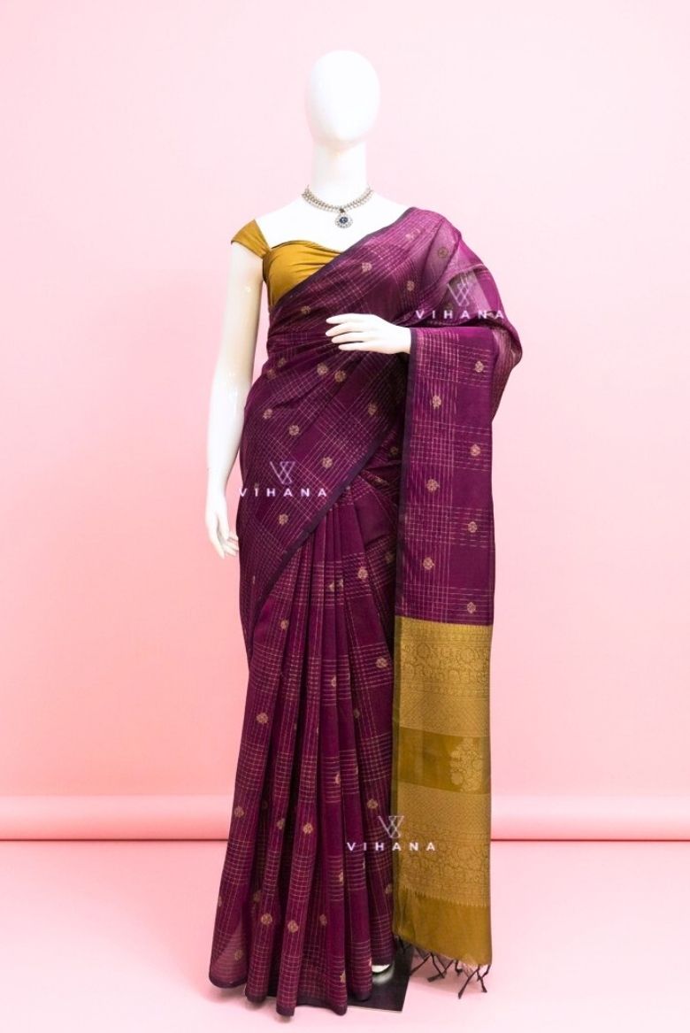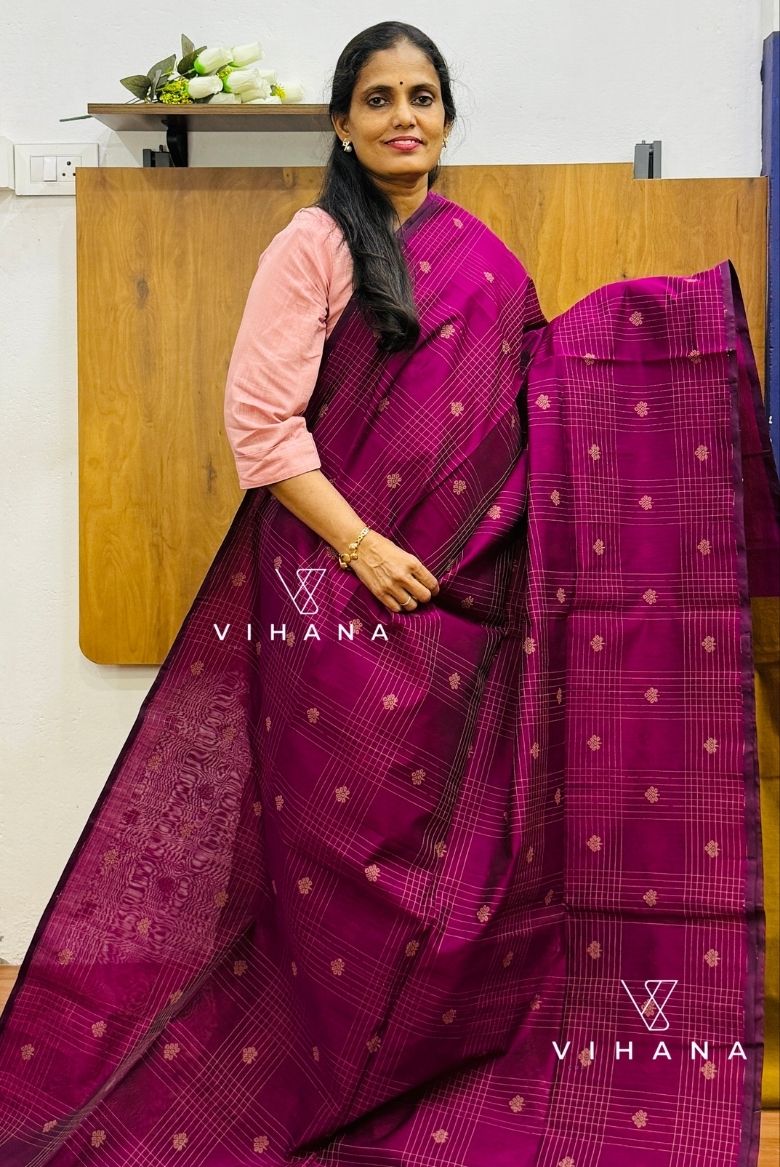 This Purple Premium Pure Handloom Silk Cotton Saree, thoughtfully crafted for modern women who cherish traditional weaves. The deep wine-purple body is adorned with elegant checks and subtle woven motifs, lending it a rich yet graceful appeal.