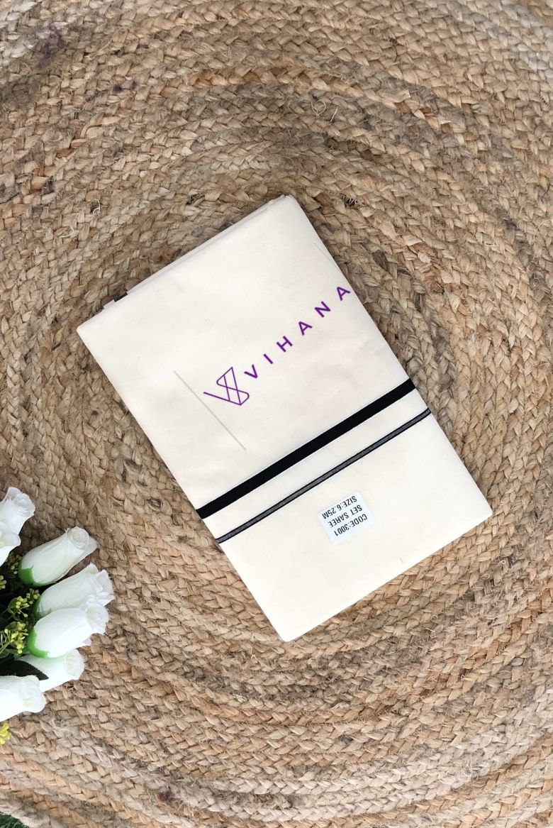 This elegant saree comes in a traditional off-white with black puliyilakara border, featuring a thin double-line stripe along with a broader solid black band.
