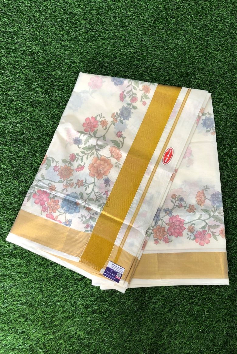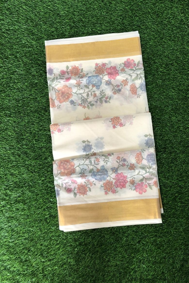 Pure Cotton Set Saree with Digital Floral Prints and Golden Border. - Vihana
