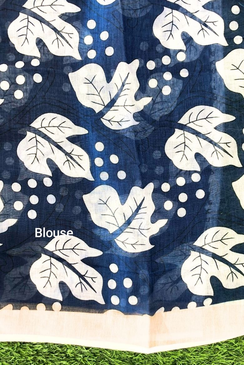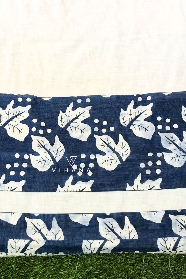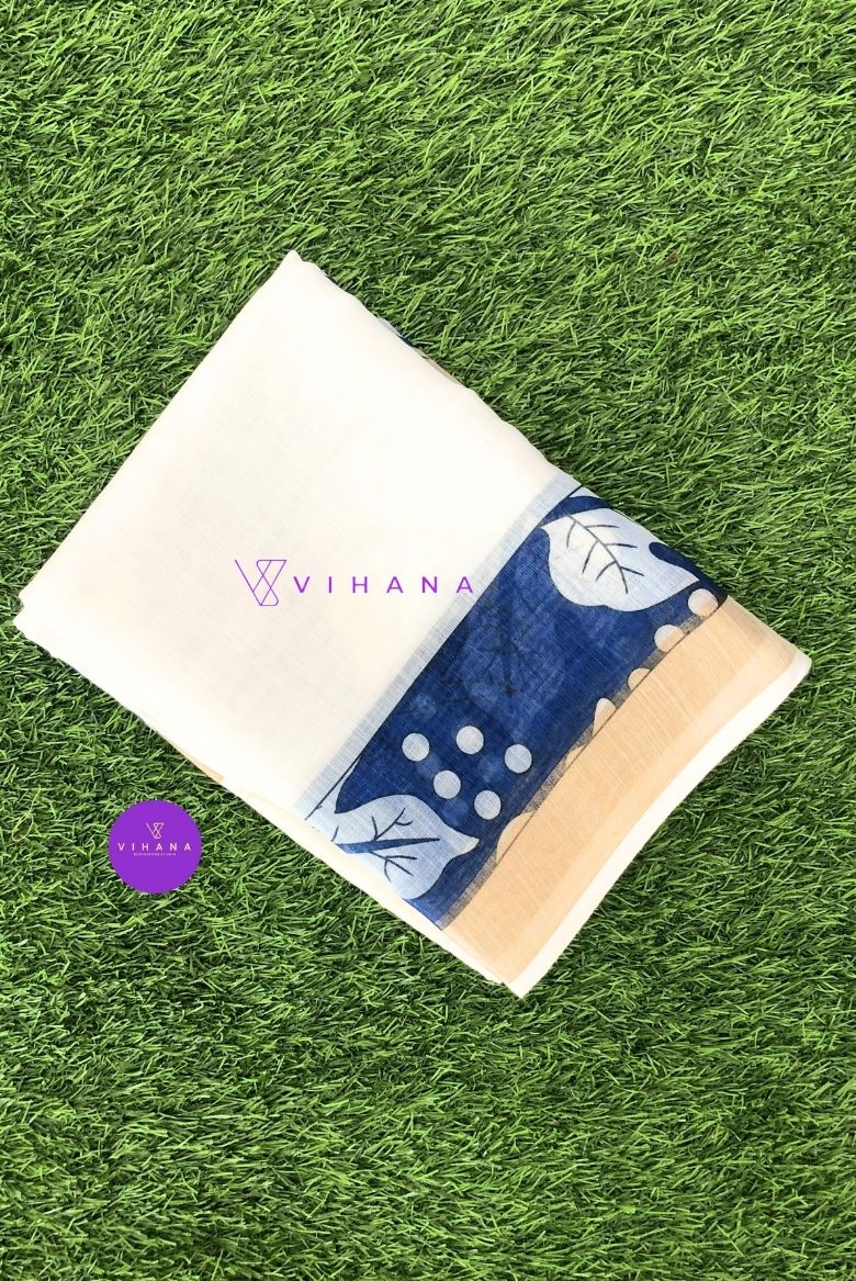 This saree is a traditional Kerala-style saree, often featuring a classic golden border (Kasavu) and exquisite digital print work in blue.
