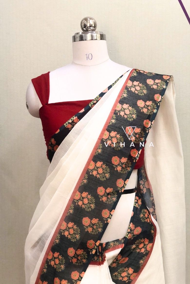The body is a classic white complemented by a vibrant blackish green and red floral border. The intricate floral patterns on the border often feature traditional motifs, sometimes inspired by Ajrakh prints.