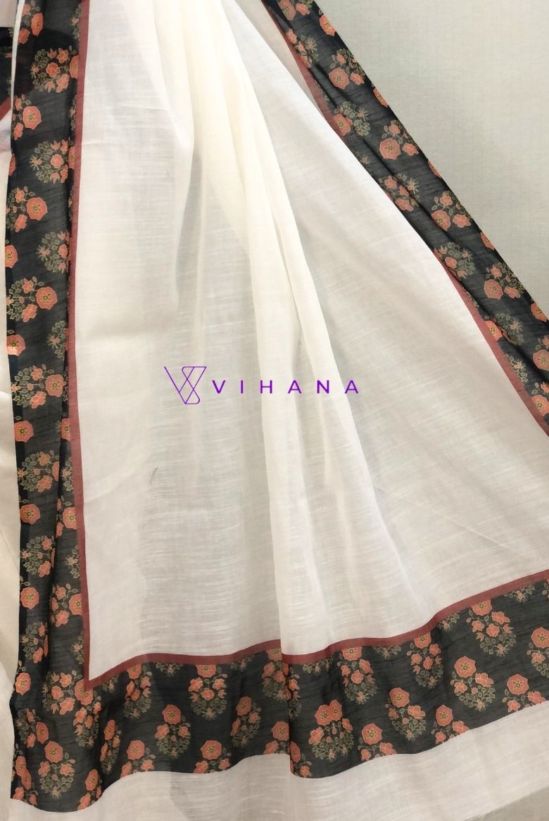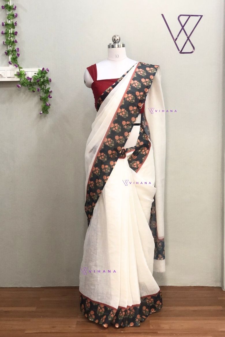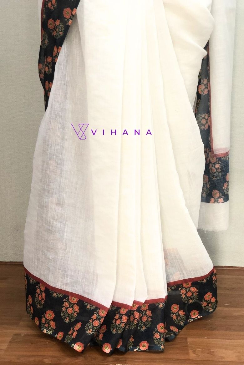 White Linen Cotton Saree with Stunning Teal Floral Border