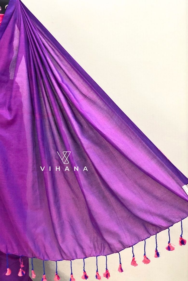 The body of this pure khadi cotton saree is a purple, accented by a broad blue border and matching tassels on the pallu.