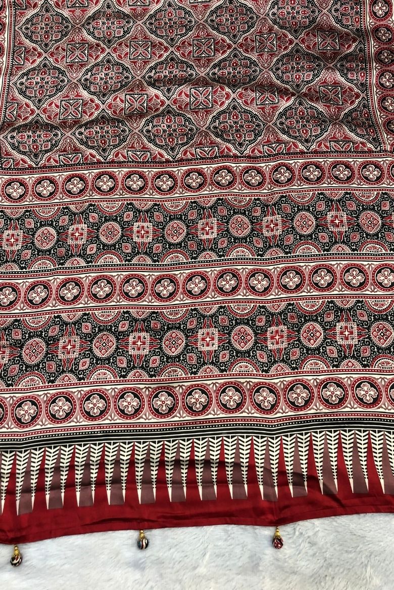 Black and Red Combination Ajrakh Print Satin Modal Silk Saree