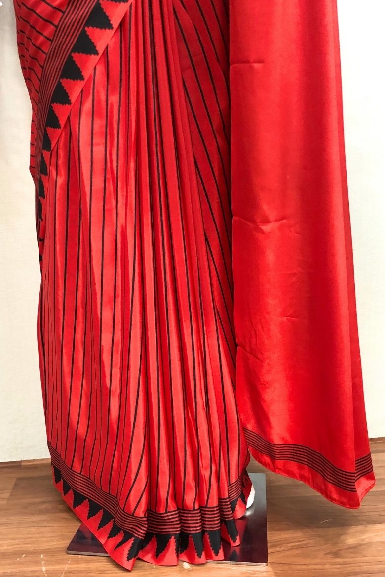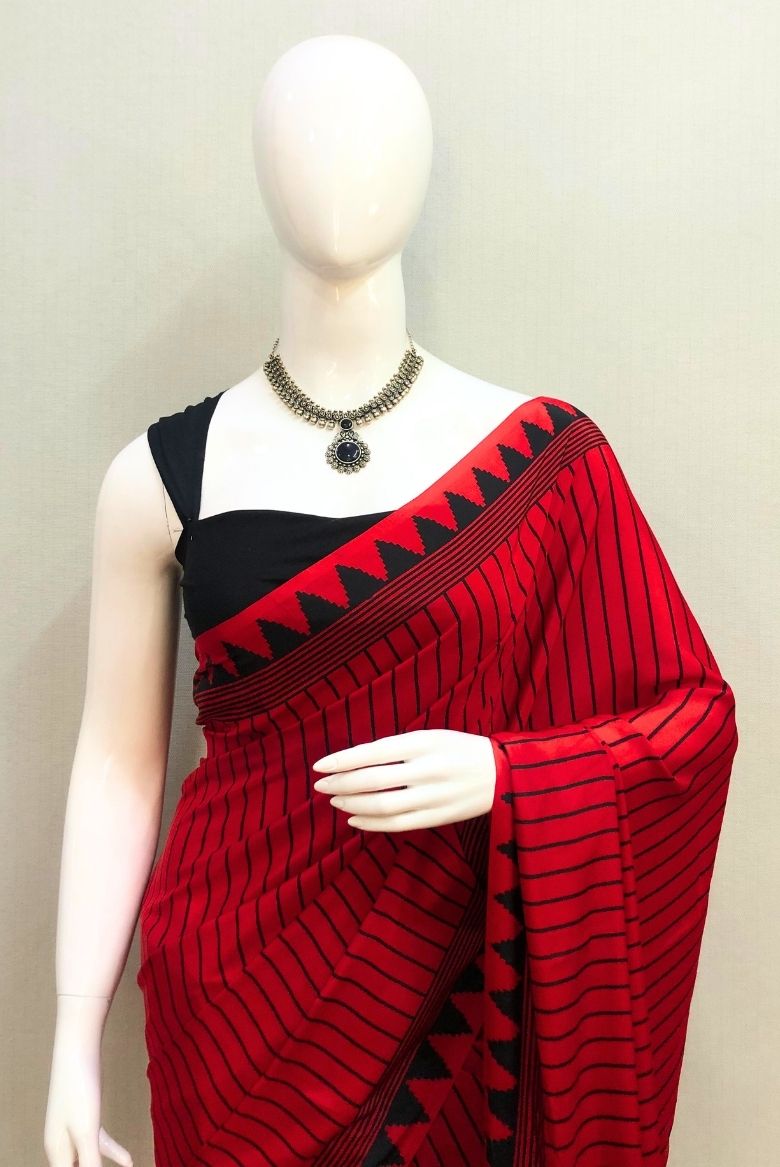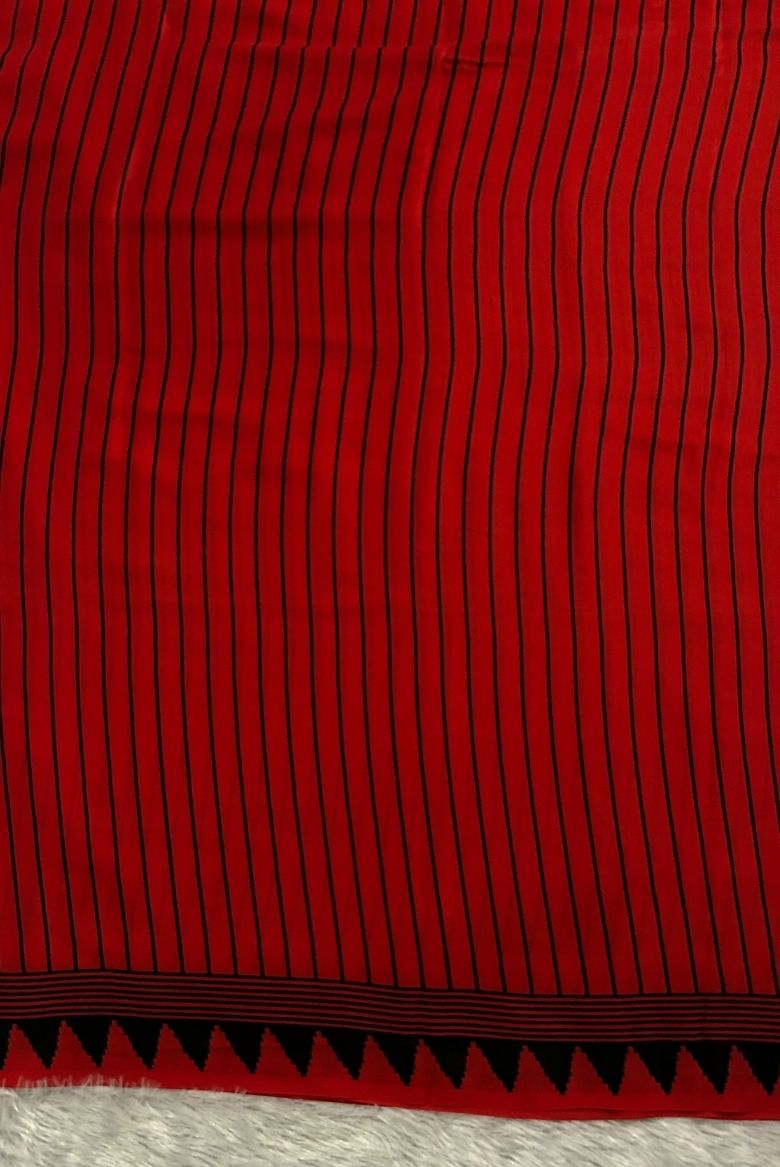 Stunning Red Modal crepe silk saree features striped pattern allover, temple designs along with striped border. The Pallu is highlighted with very large polka dot.