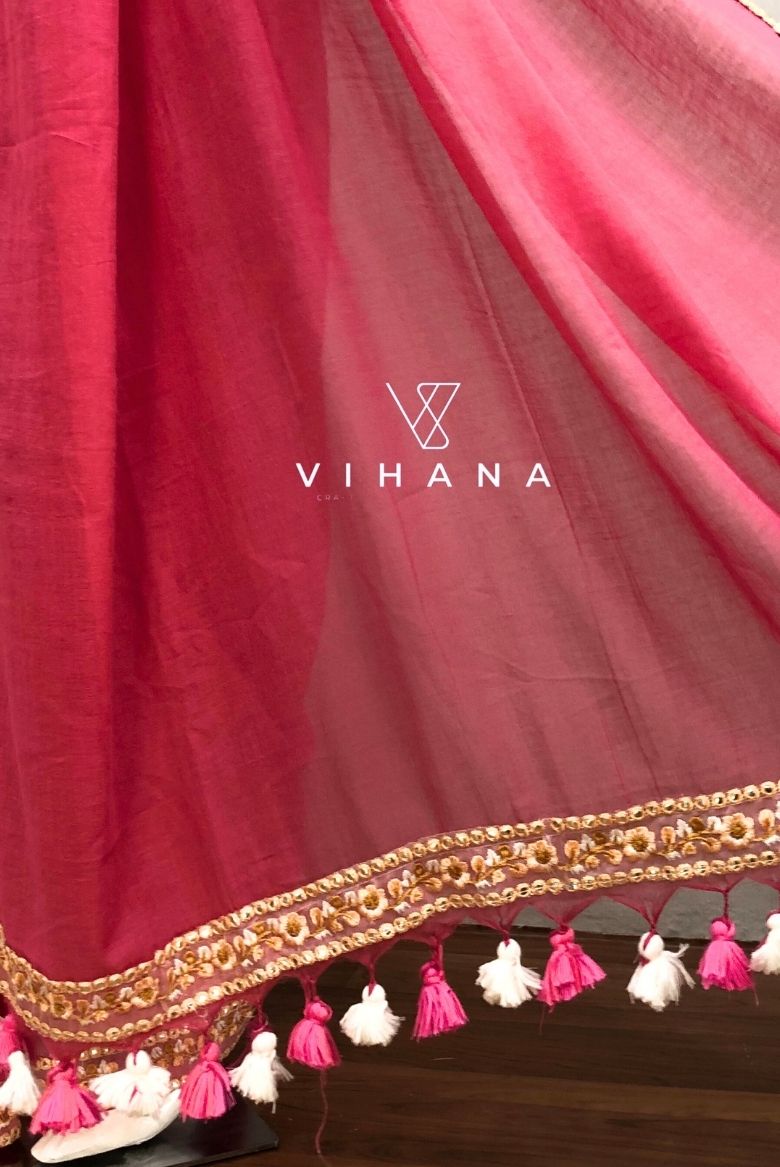 This saree features a Subtle pink base color. There is a beautiful lace with mirror and light orange thread work are attached along the edges. Tassels are highlighted in the pallu of the saree.
