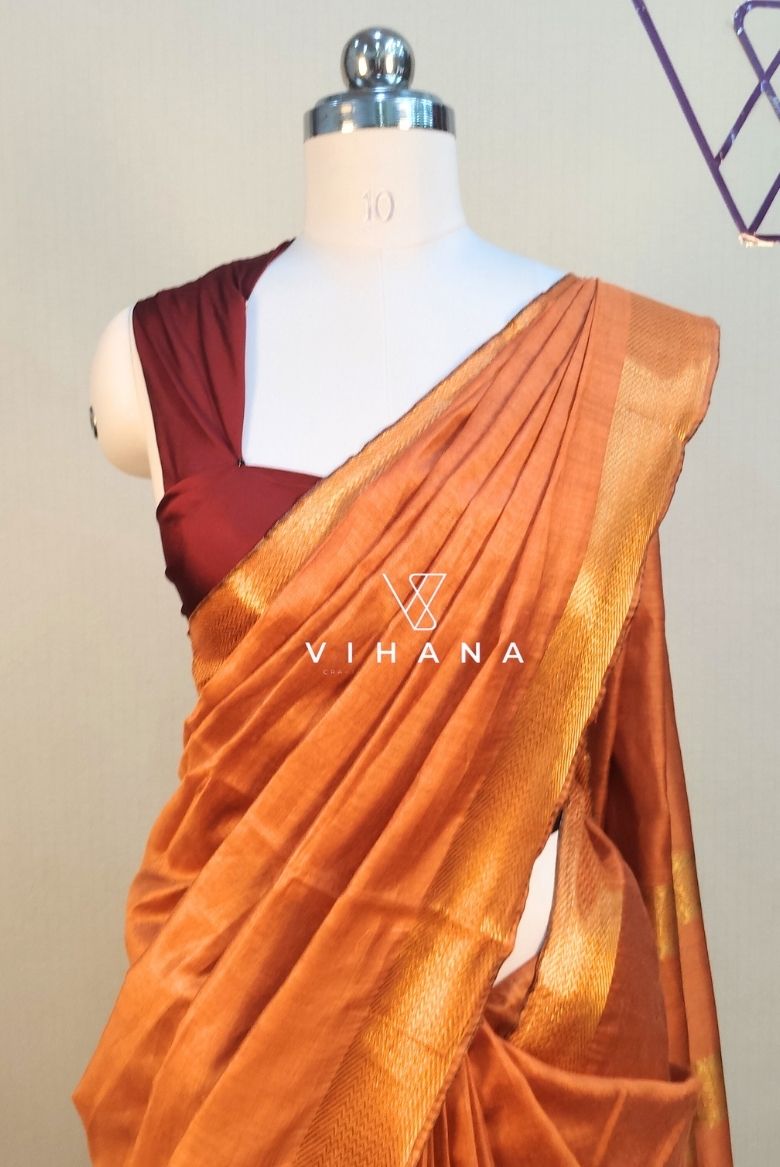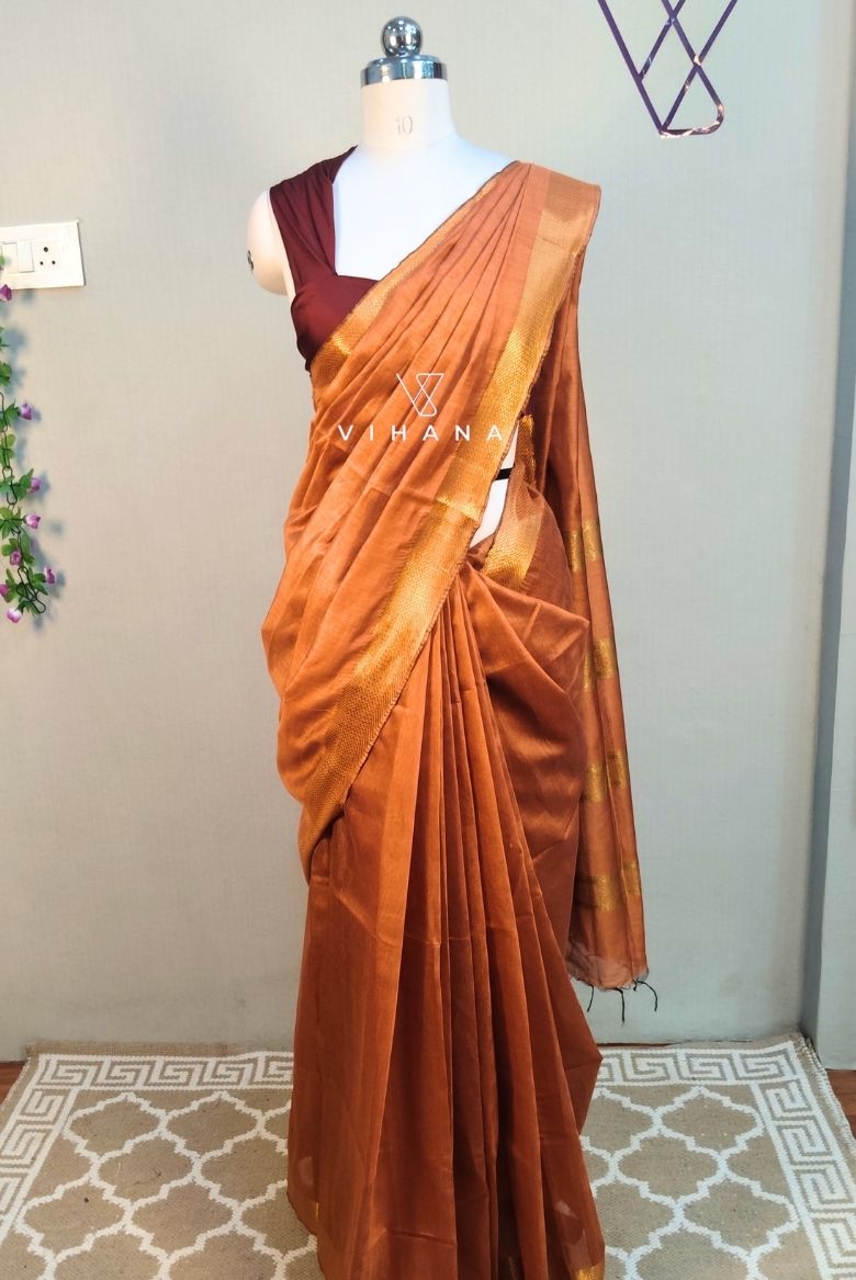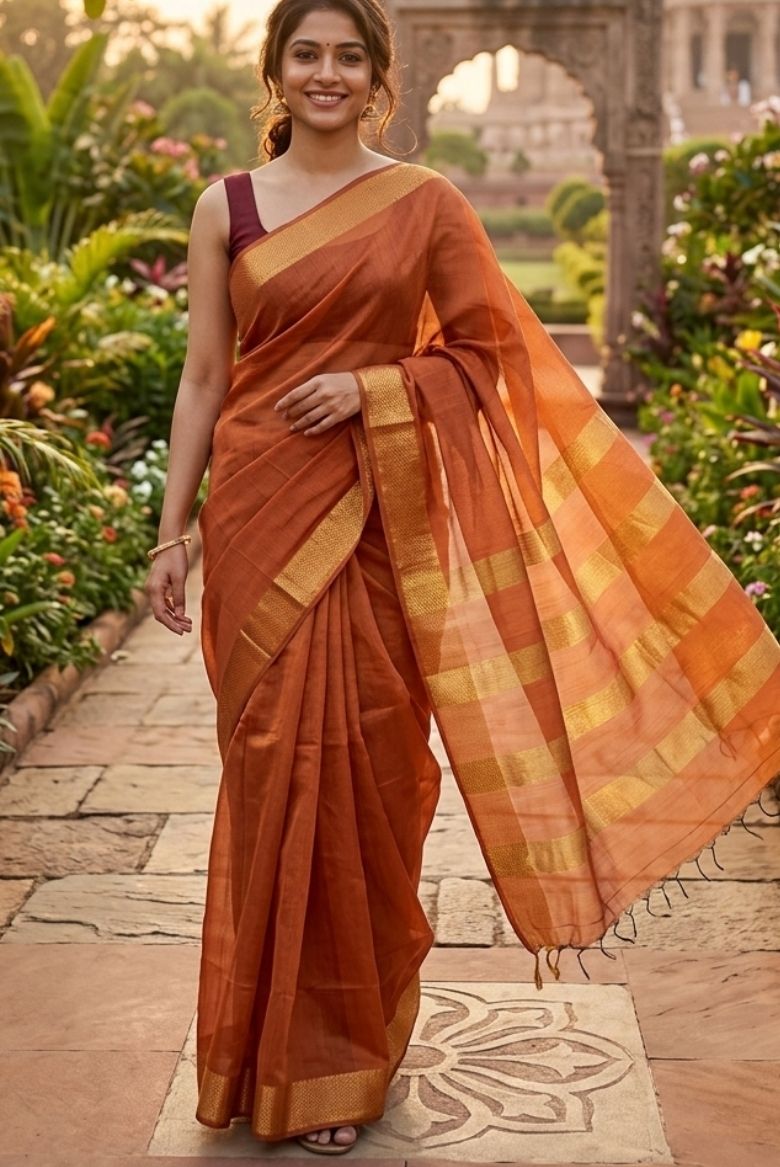 The primary color is a rich rust orange or bronze -copper, often paired with a darker contrasting blouse, such as the maroon or dark brown shown. The saree includes a classic zari border (metallic threadwork) that enhances its opulent look. Some variations also feature subtle floral woven motifs or metallic gold/silver zari work throughout the body.