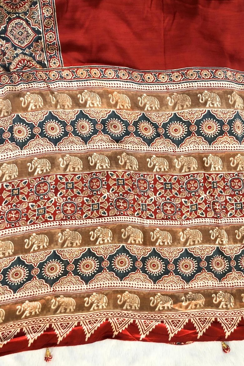 Featuring Ajrakh-inspired block prints and a beautifully detailed pallu with traditional elephant and floral motifs, this saree is designed for women who adore heritage with a modern twist.