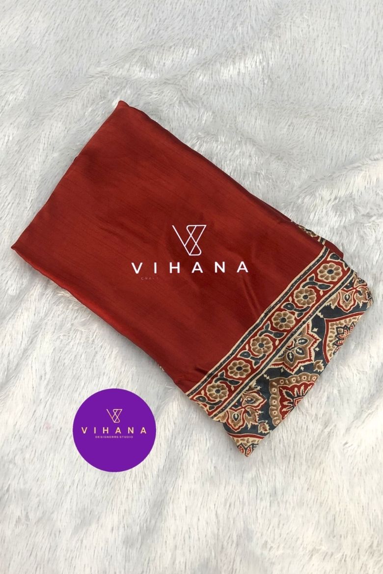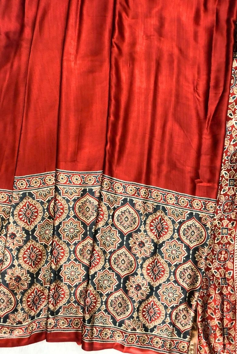 2 February 2026Rust Orange Modal Satin Silk Saree with Traditional Ajrakh Print