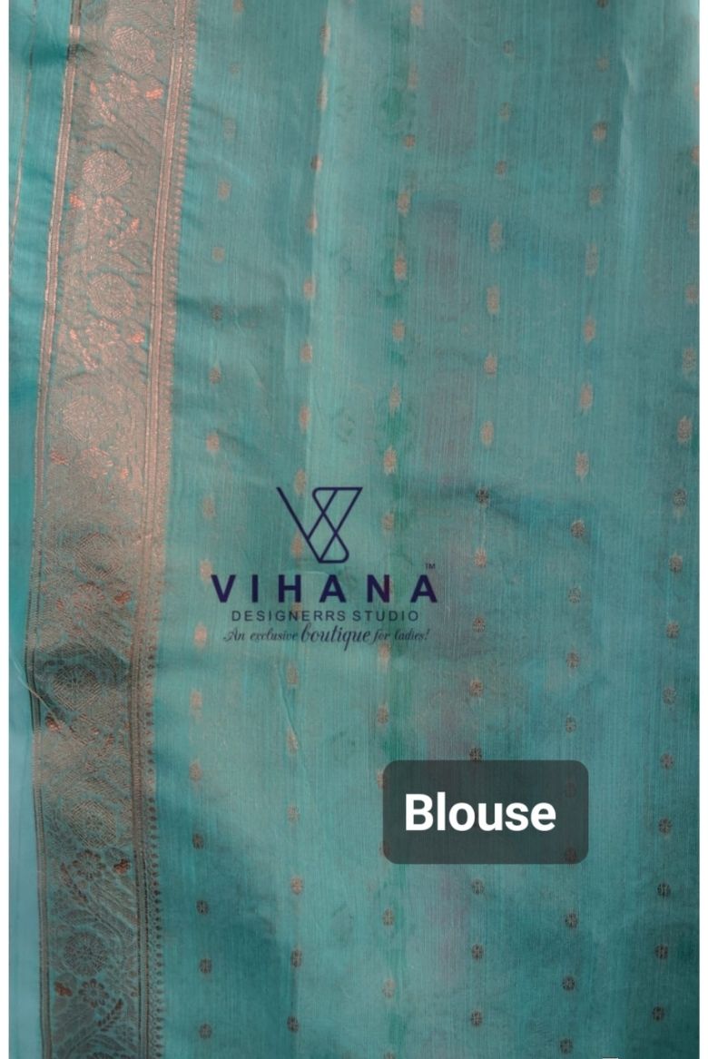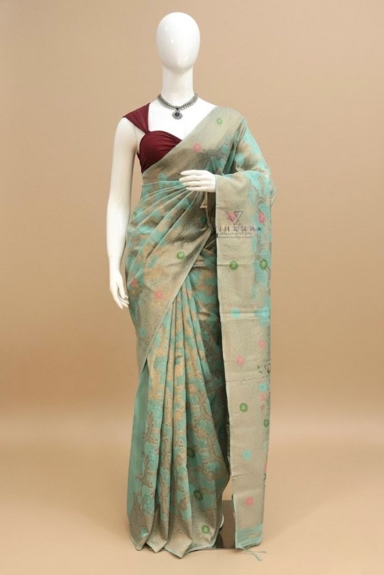 Embrace timeless charm in this light blue linen-cotton saree with intricate Banarasi-style woven designs. Soft, graceful, and effortlessly elegant, this saree beautifully balances comfort with sophistication—perfect for special occasions