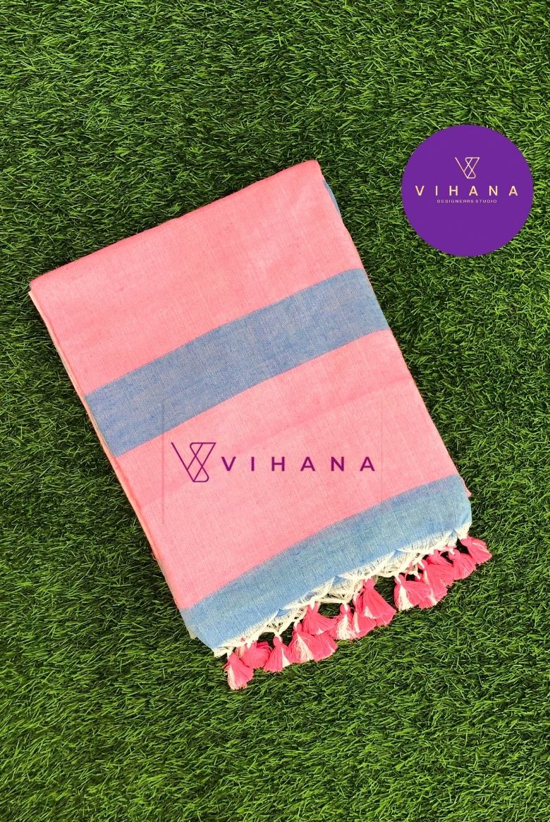 Bright and refreshing, this elegant saree features pink and soft blue horizontal stripes that create a striking yet graceful look. The beautifully coordinated border with fine stripe detailing enhances its charm, while the lightweight fabric ensures all-day comfort. Finished with delicate tassels on the pallu, this saree is perfect for casual gatherings, festive mornings, and effortless everyday elegance. Pair it with a contrasting blouse to complete the vibrant look.