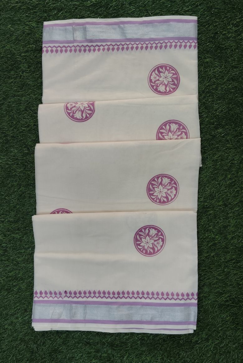 This set saree is embellished with printed lotus (or similar floral) motifs in a matching lavender color, strategically placed to enhance the traditional appeal. The border and pallu (the part draped over the shoulder) feature a thick lavender band, likely combined with a subtle silver kasavu (zari) line, which creates an elegant contrast against the light body.