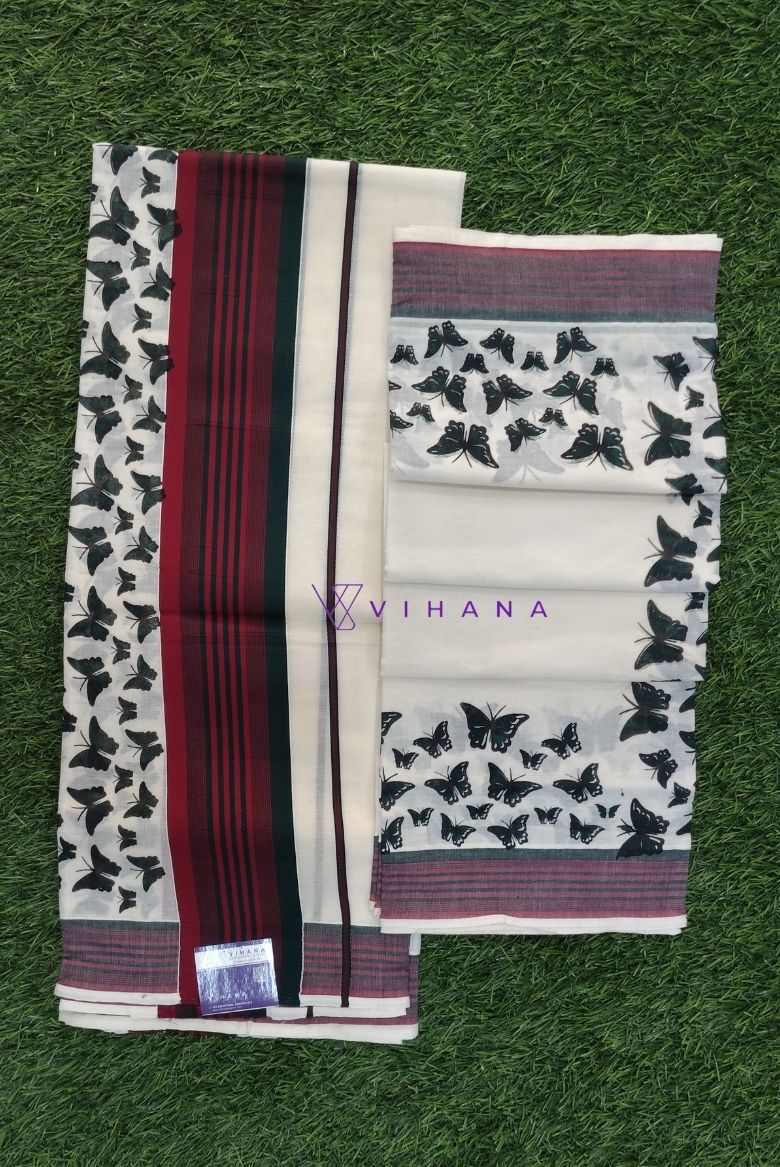 13 February 2026Traditional Kerala Attire along Maroon and Green Stripes with Butterfly Print Borders