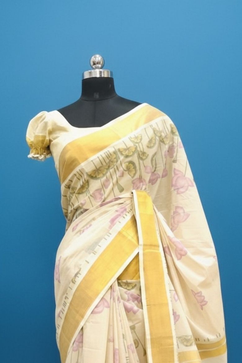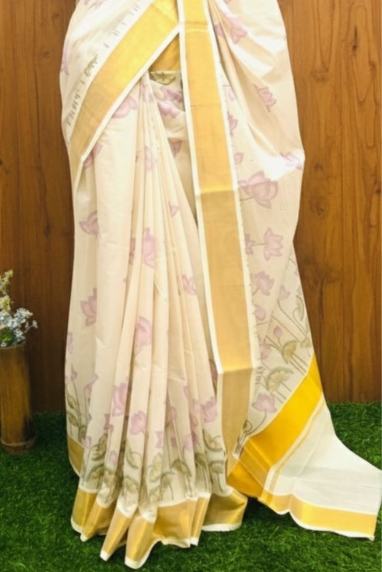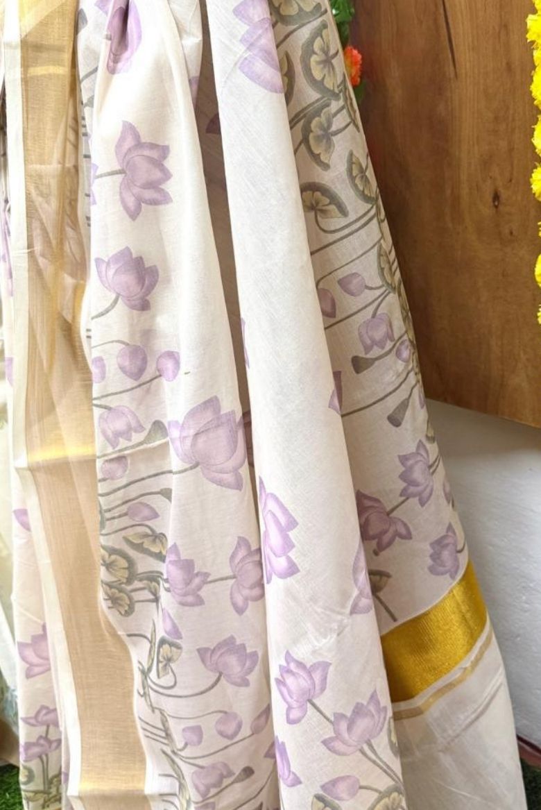 This beautiful Kerala cotton setsaree features a traditional offwhite base with a striking golden kasavu border . The body of the saree is adorned with an allover 3D digital print of pink lotus motifs and have an elegant pallu .