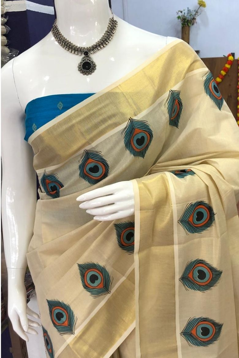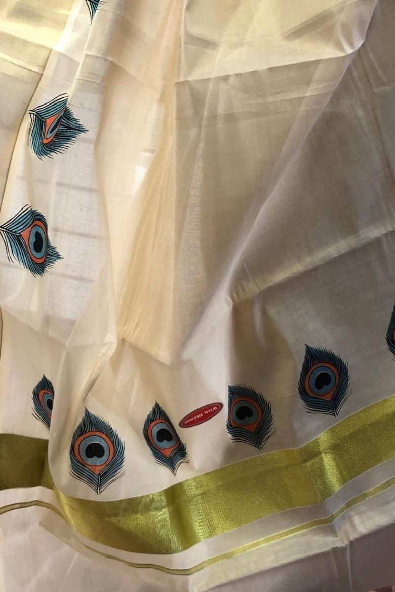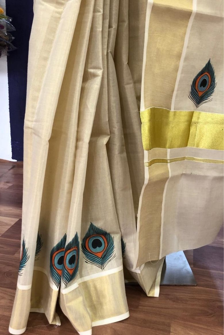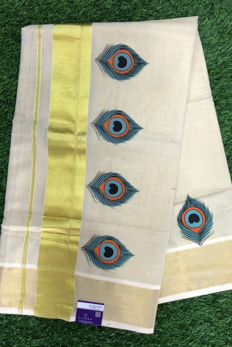 Traditional Kerala Golden Tissue SetSaree with Peacock Feather Prints - Vihana