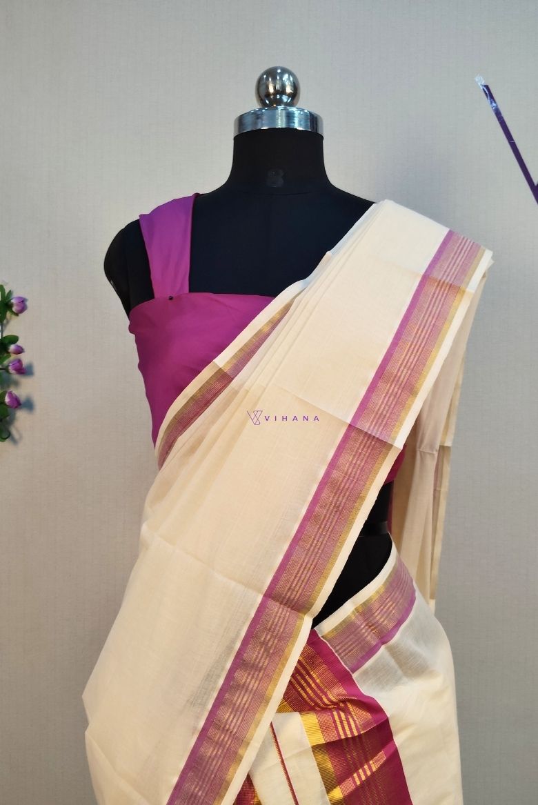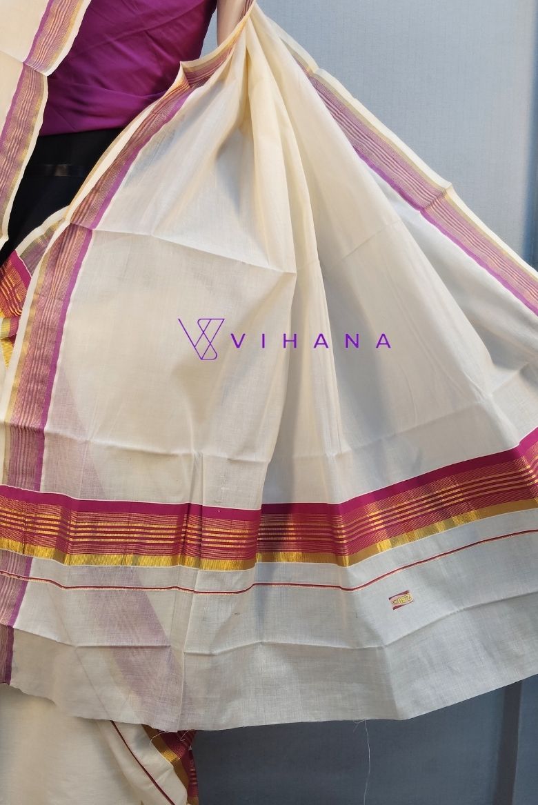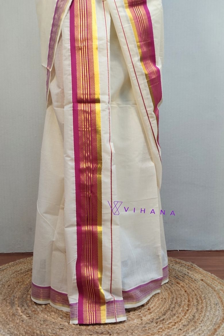 The main body of the garment is off-white or unbleached white, featuring vibrant pink and golden kasavu borders .