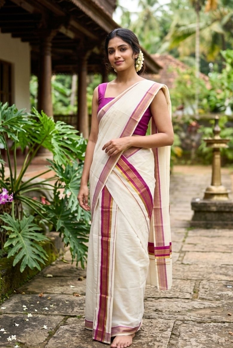 13 February 2026Traditional Kerala Set Mundu with Pink and Gold Kasavu Border