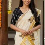 Traditional Kerala Attire Along Blue and Red Stripes with Butterfly Print Borders