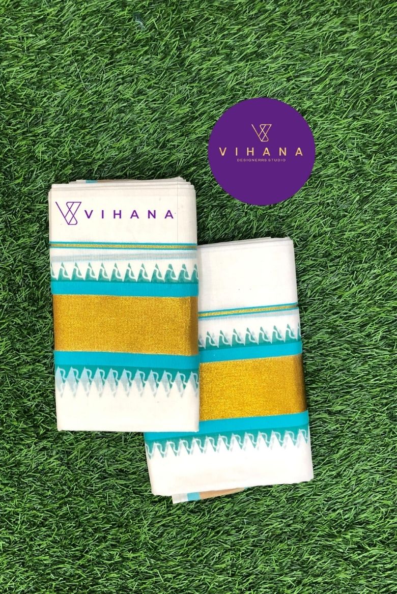 10 February 2026Traditional Kerala Set Mundu with Turquoise and Golden Zari Border