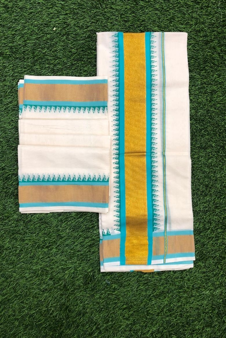 This set mundu features an elegant border design with both golden zari work and a prominent turquoise blue band with a decorative temple design.