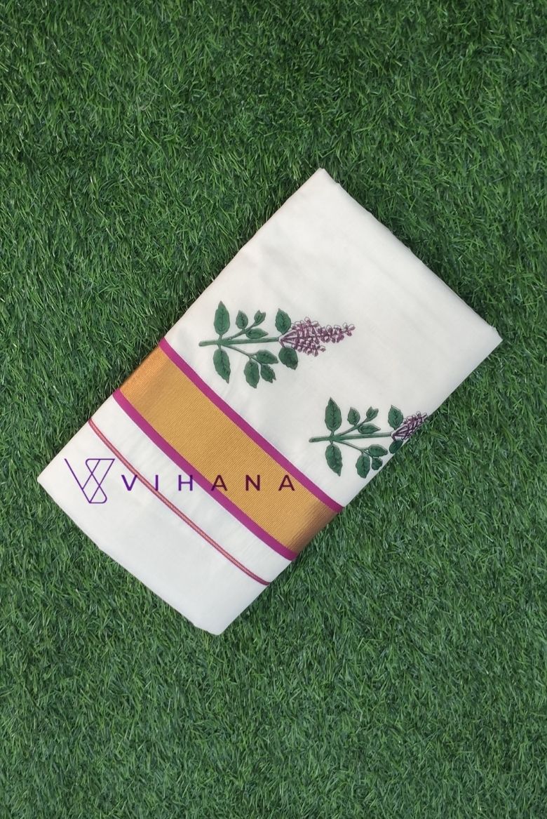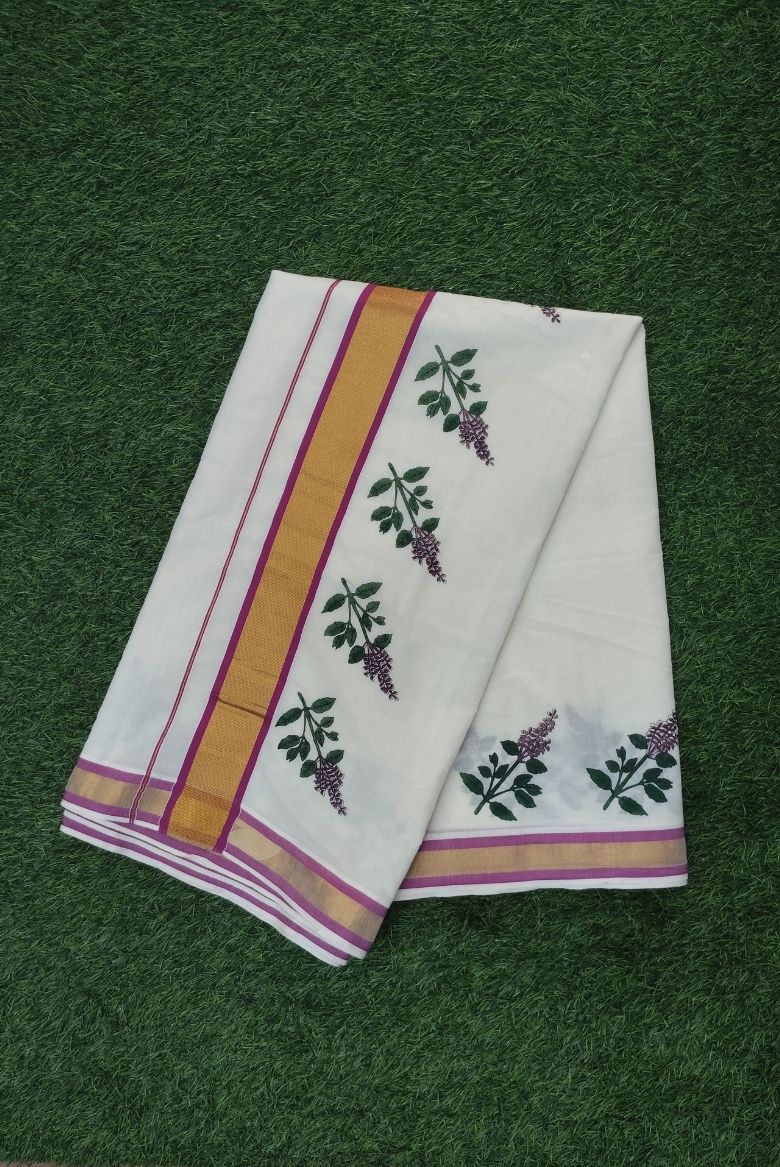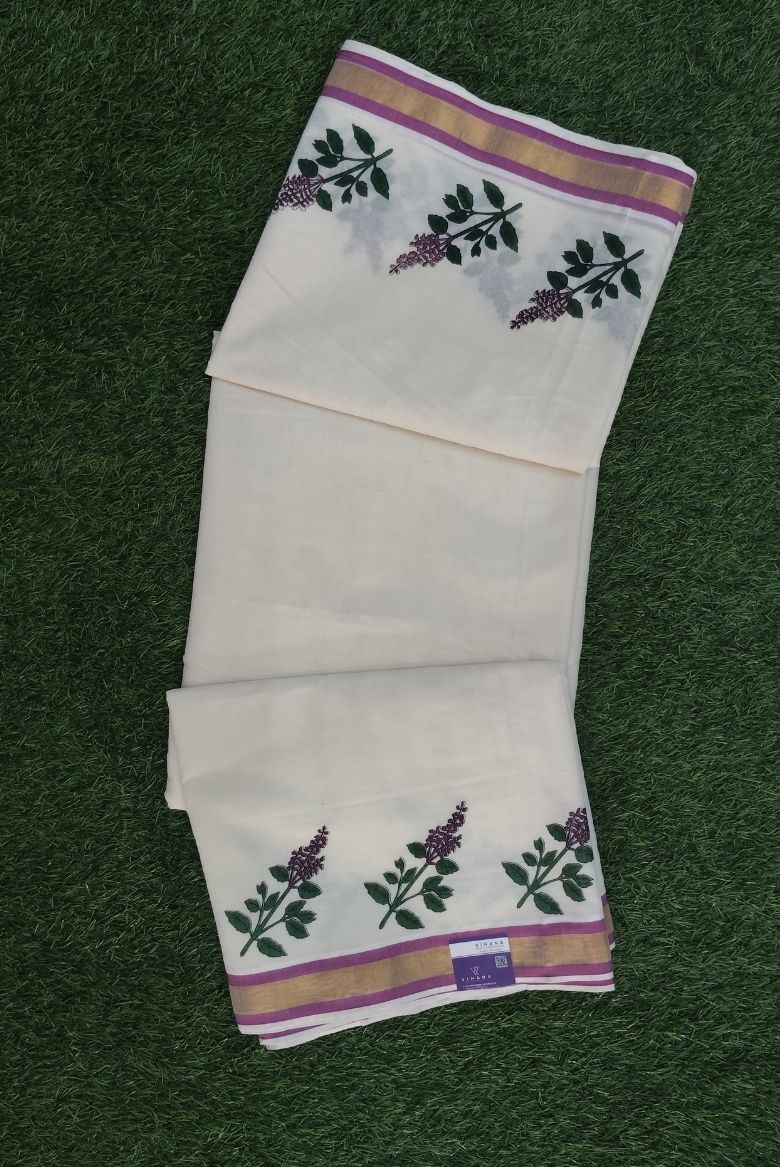 This Saree features the iconic golden Zari (Kasavu) border, beautifully accented with a vibrant magenta stripe. The body is adorned with delicate hand-blocked floral motifs in shades of purple and forest green, adding a modern botanical twist to a classic silhouette.