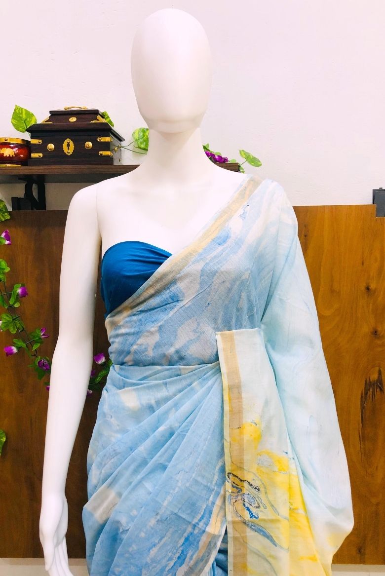 This katan silk saree features intricate, fluid hand-marbled patterns in vibrant shades of sky blue and sunny yellow, transforming it into a wearable work of art. The abstract design offers a modern interpretation of traditional craftsmanship.
