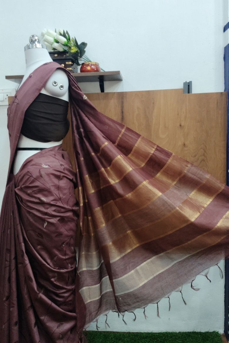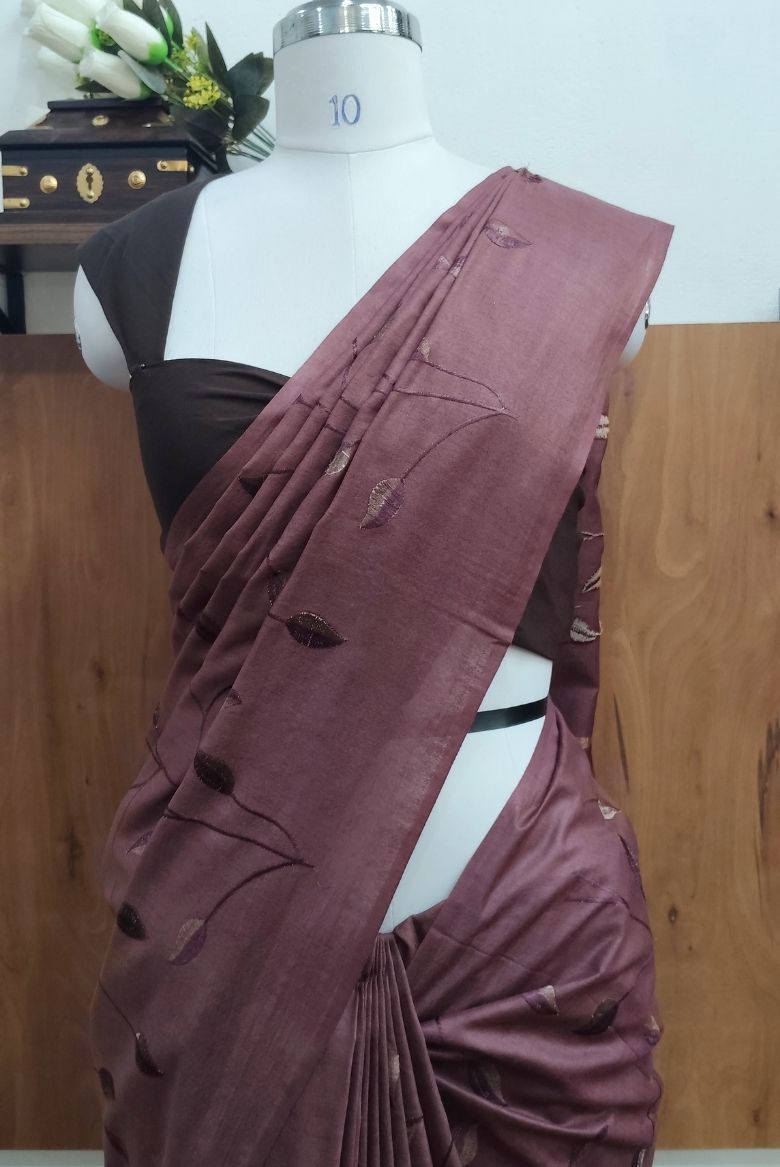 26 December 2025This Kota Munga Silk Saree featuring elegant leaf pattern embroidery , Pallu has a shade with simple golden zari border.