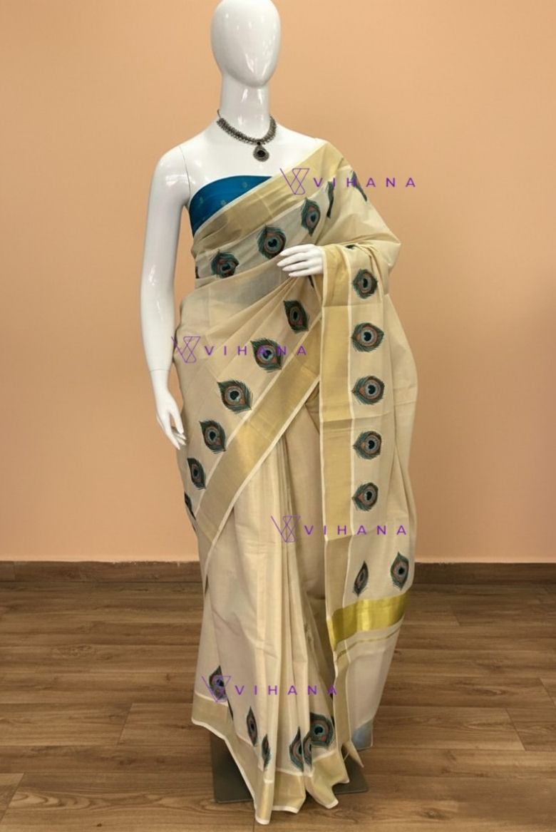 Traditional Kerala Golden Tissue SetSaree with Peacock Feather Prints
