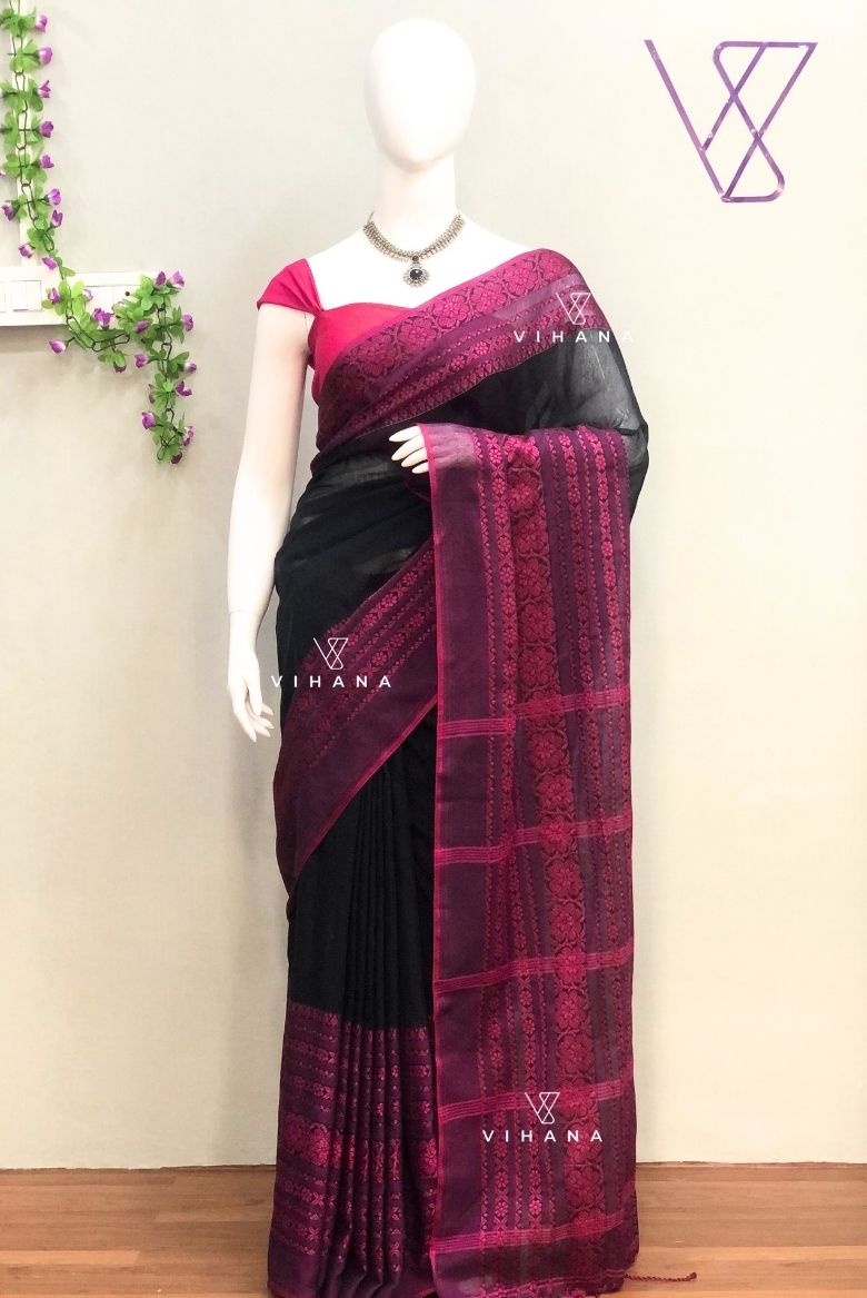 Black and Magenta Begampuri Bengal Cotton Saree